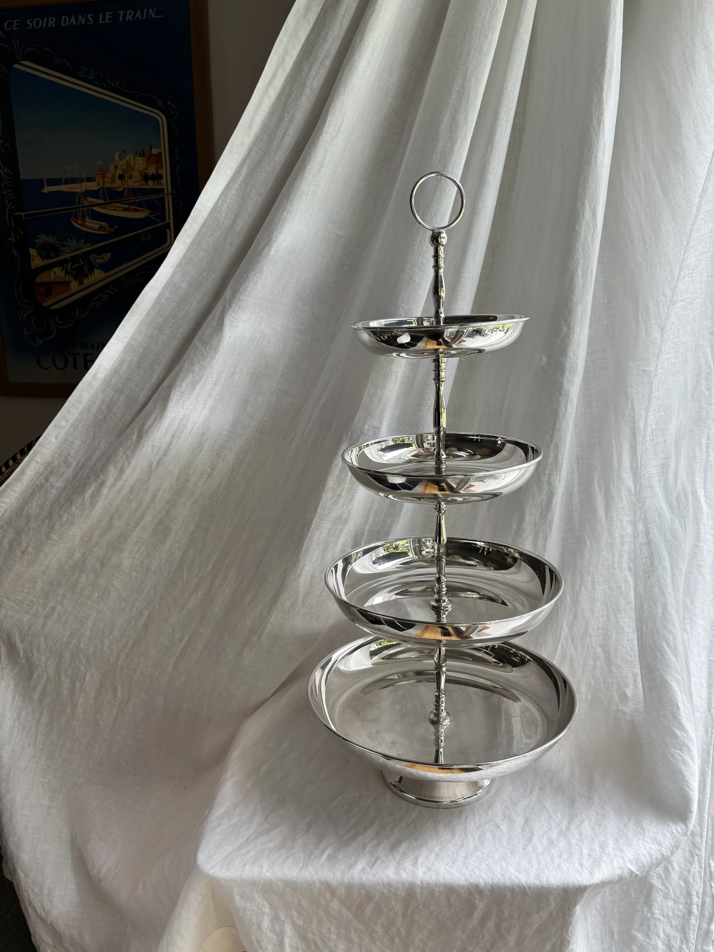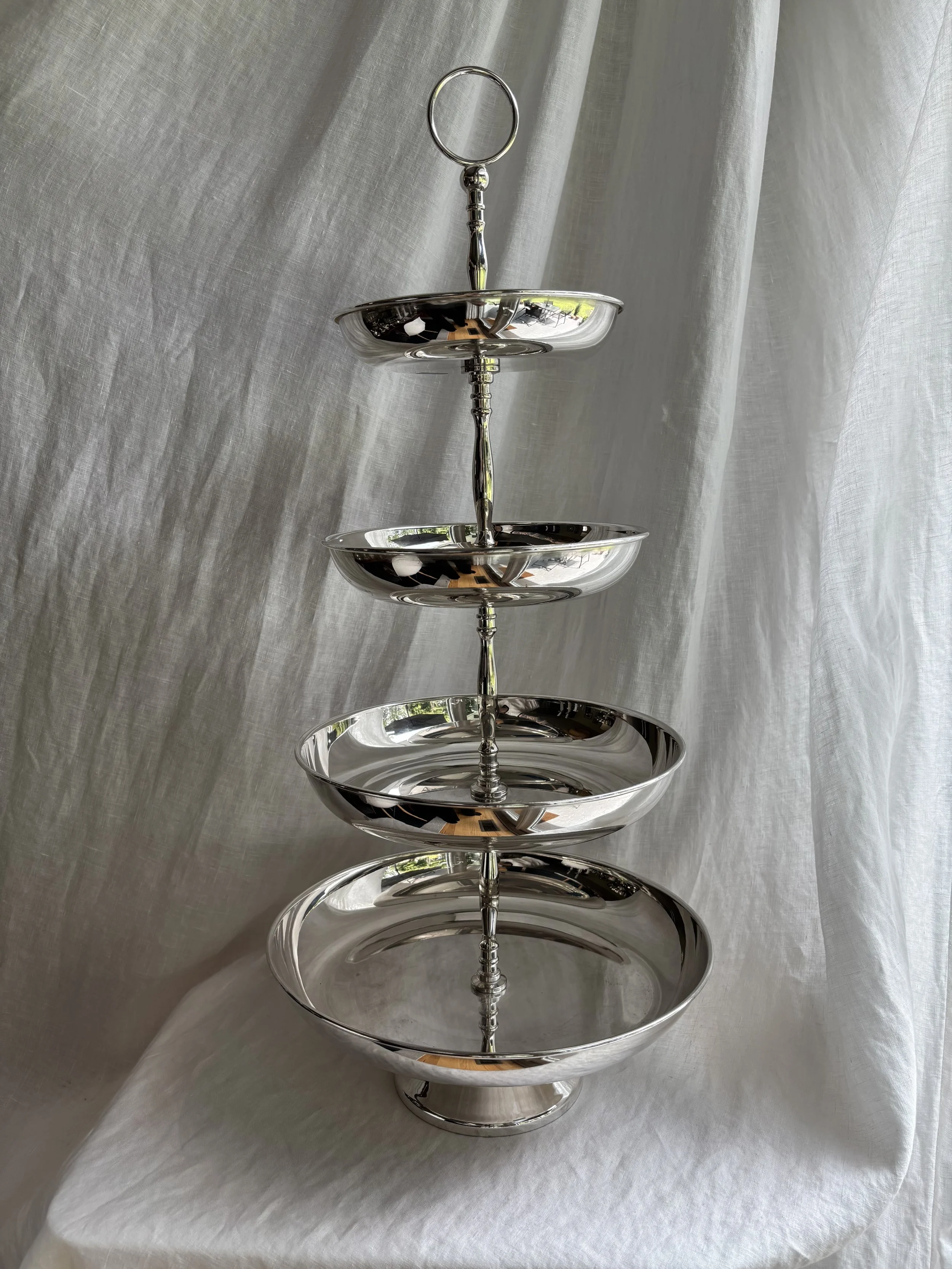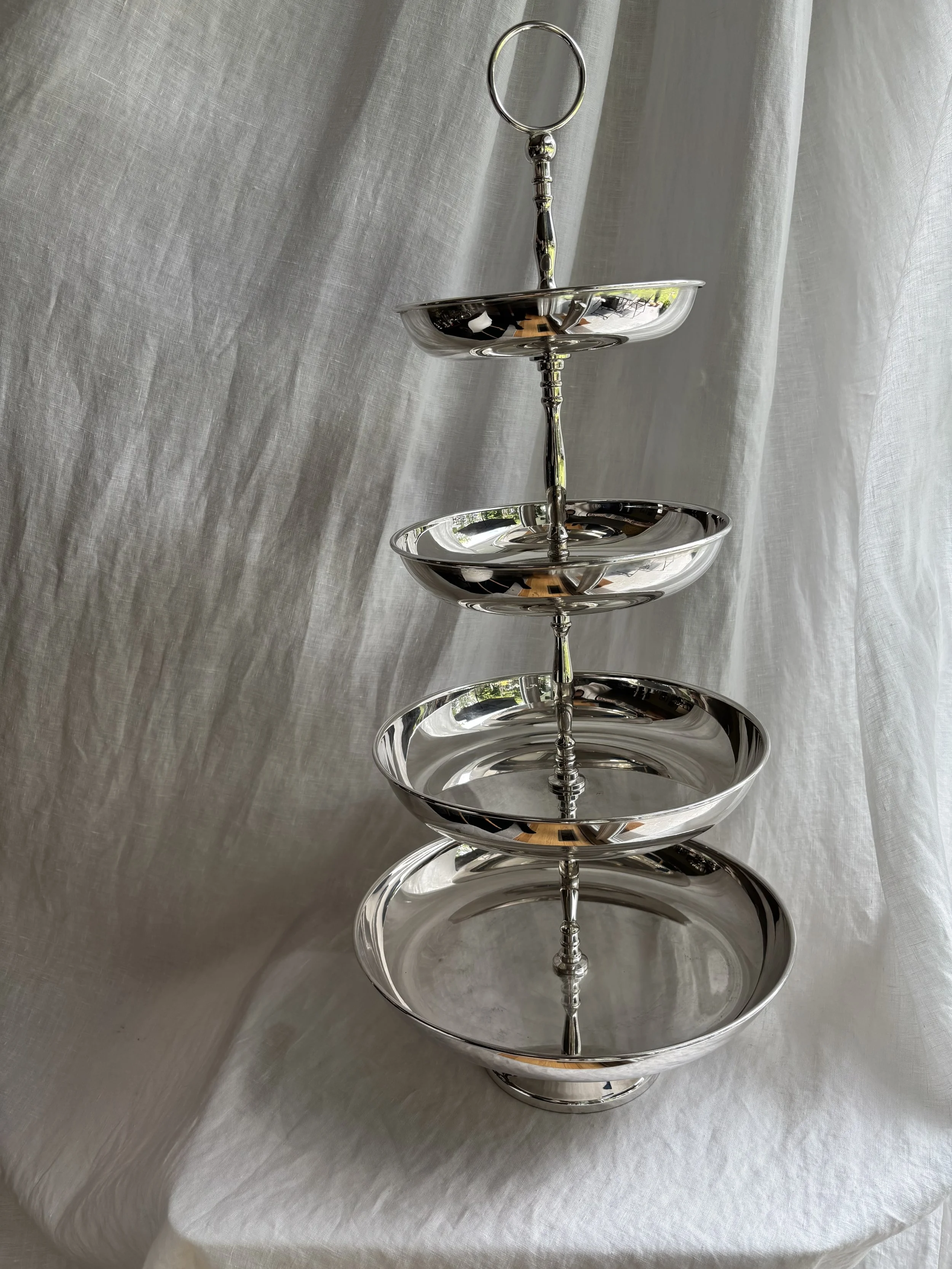 Incredible serving tower featuring four tiers with rounded rims, central finial with ring handle top, and rounded base.