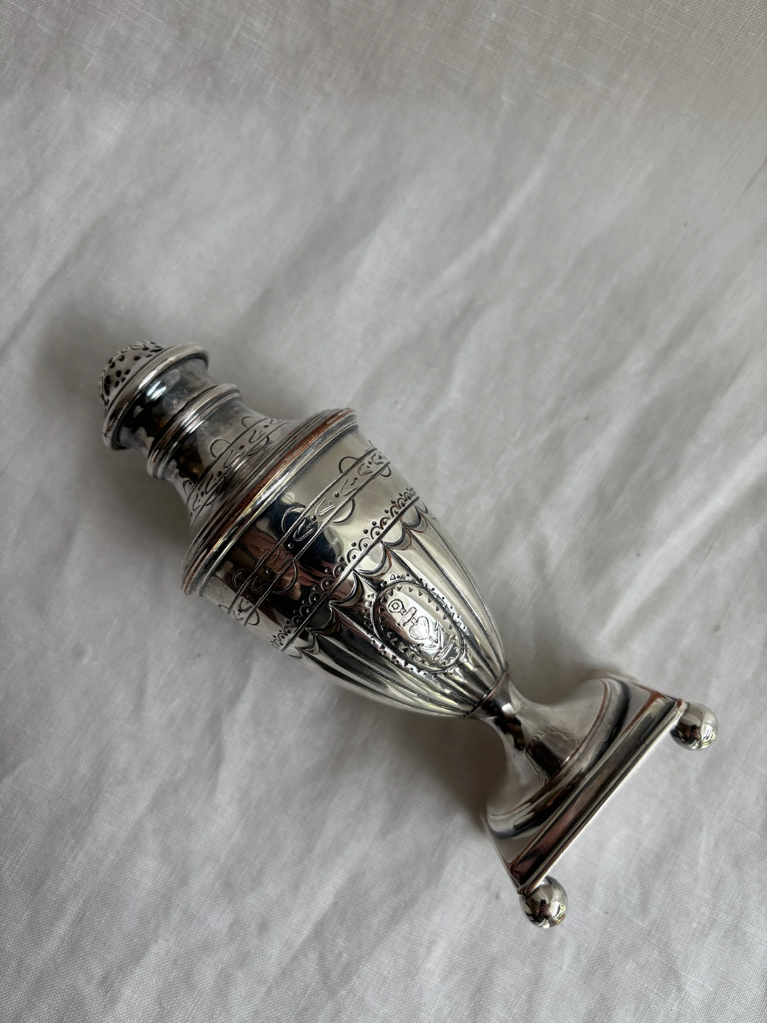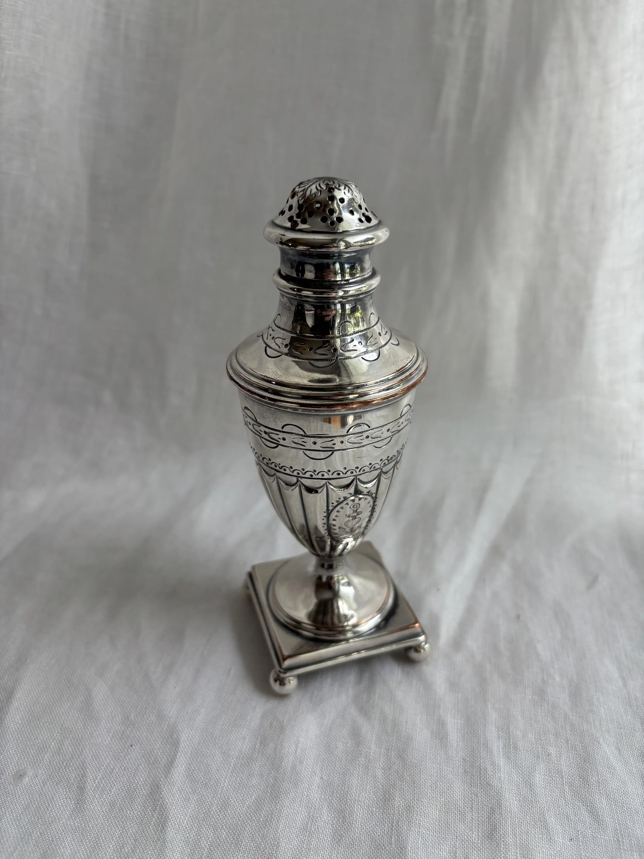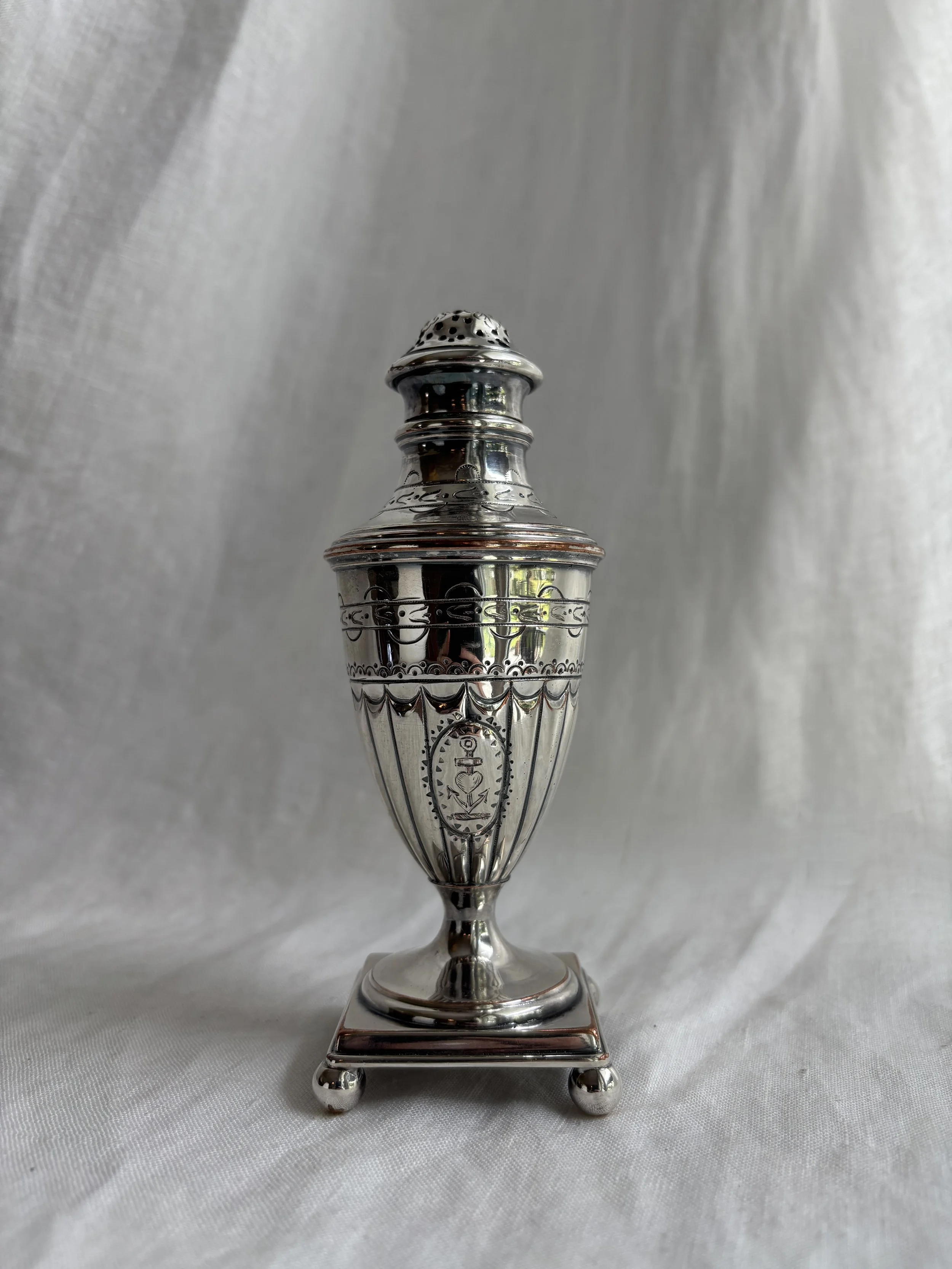 Gorgeous antique sugar caster in silver plate over copper in an urn design with spherically footed square base and featuring intricate etching details throughout and a central very charming love heart and anchor at center front.