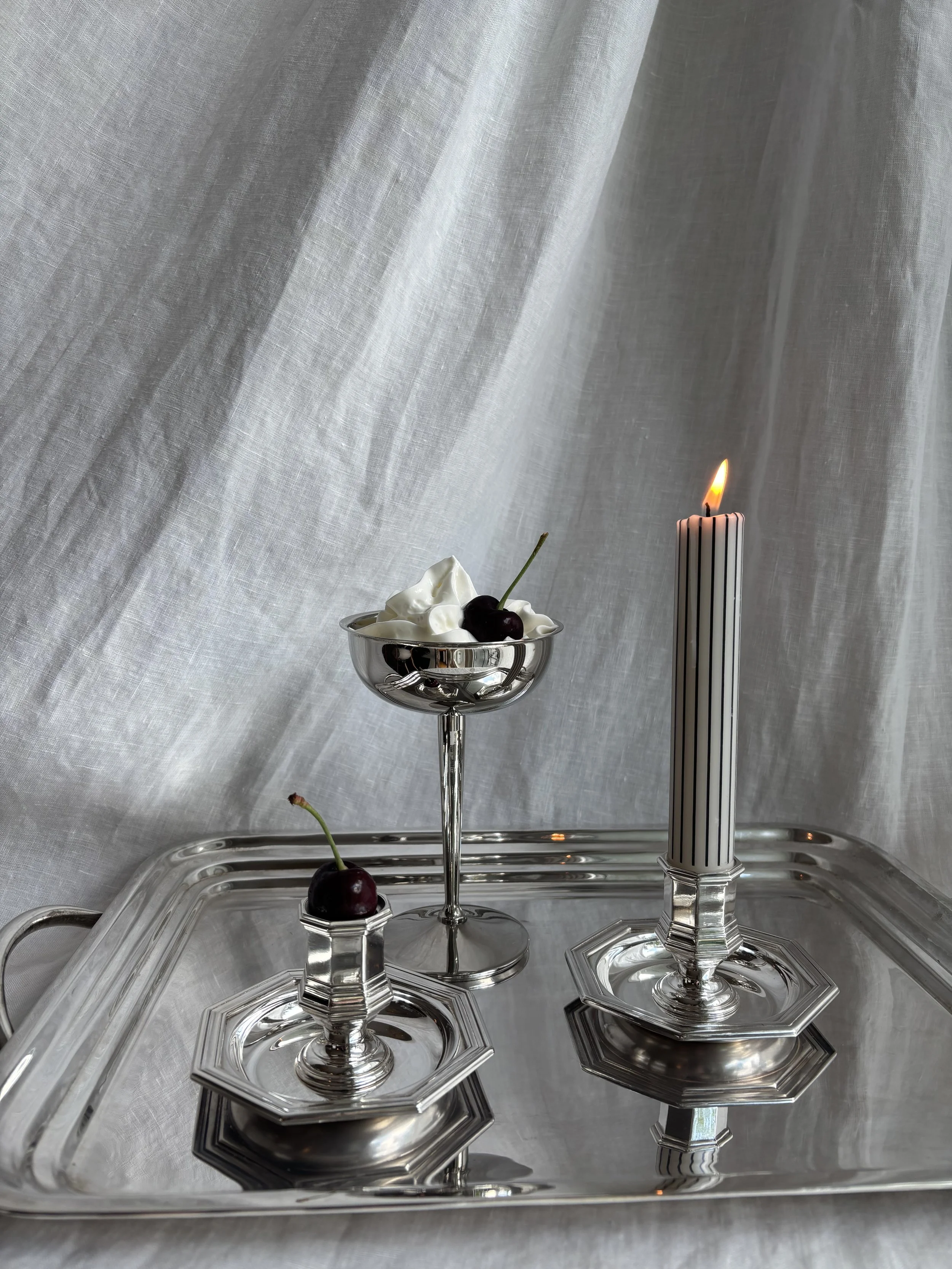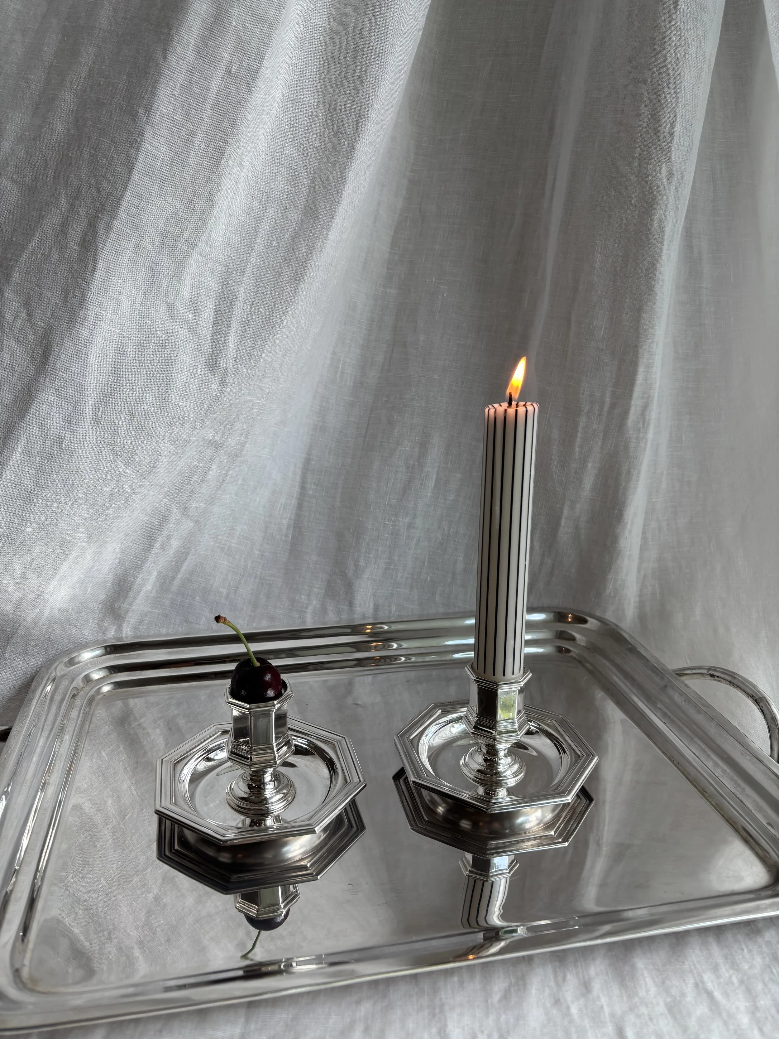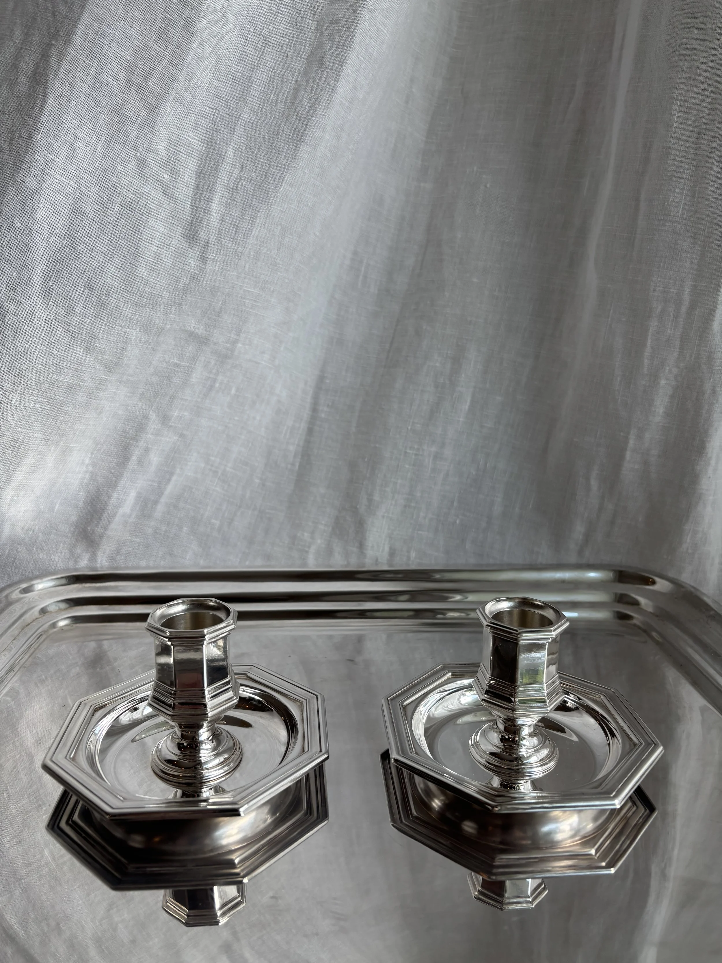 Gorgeous set of two Christofle candle holders featuring octagonal bases and necks. Lovely weight in hand. Made in France.