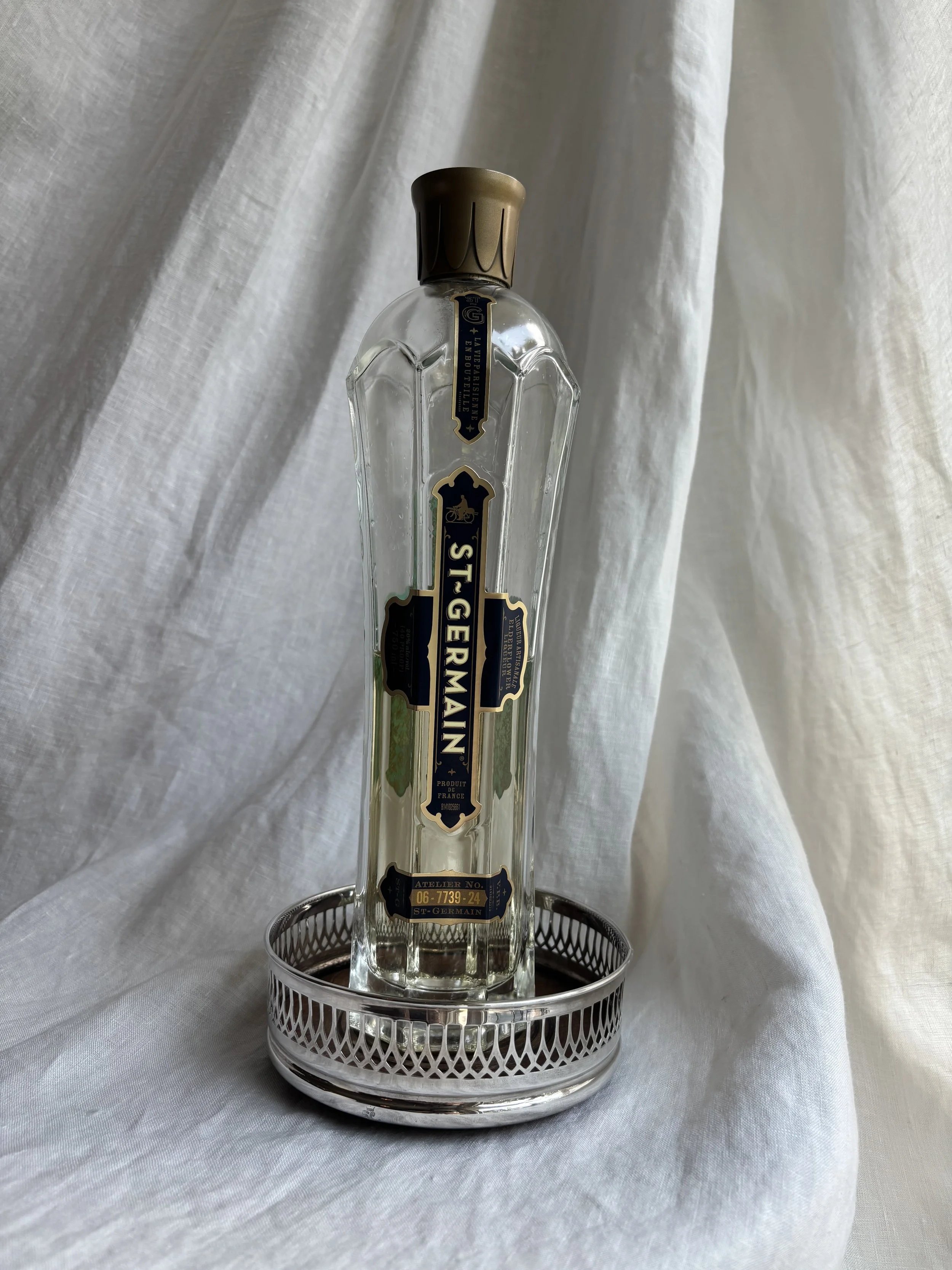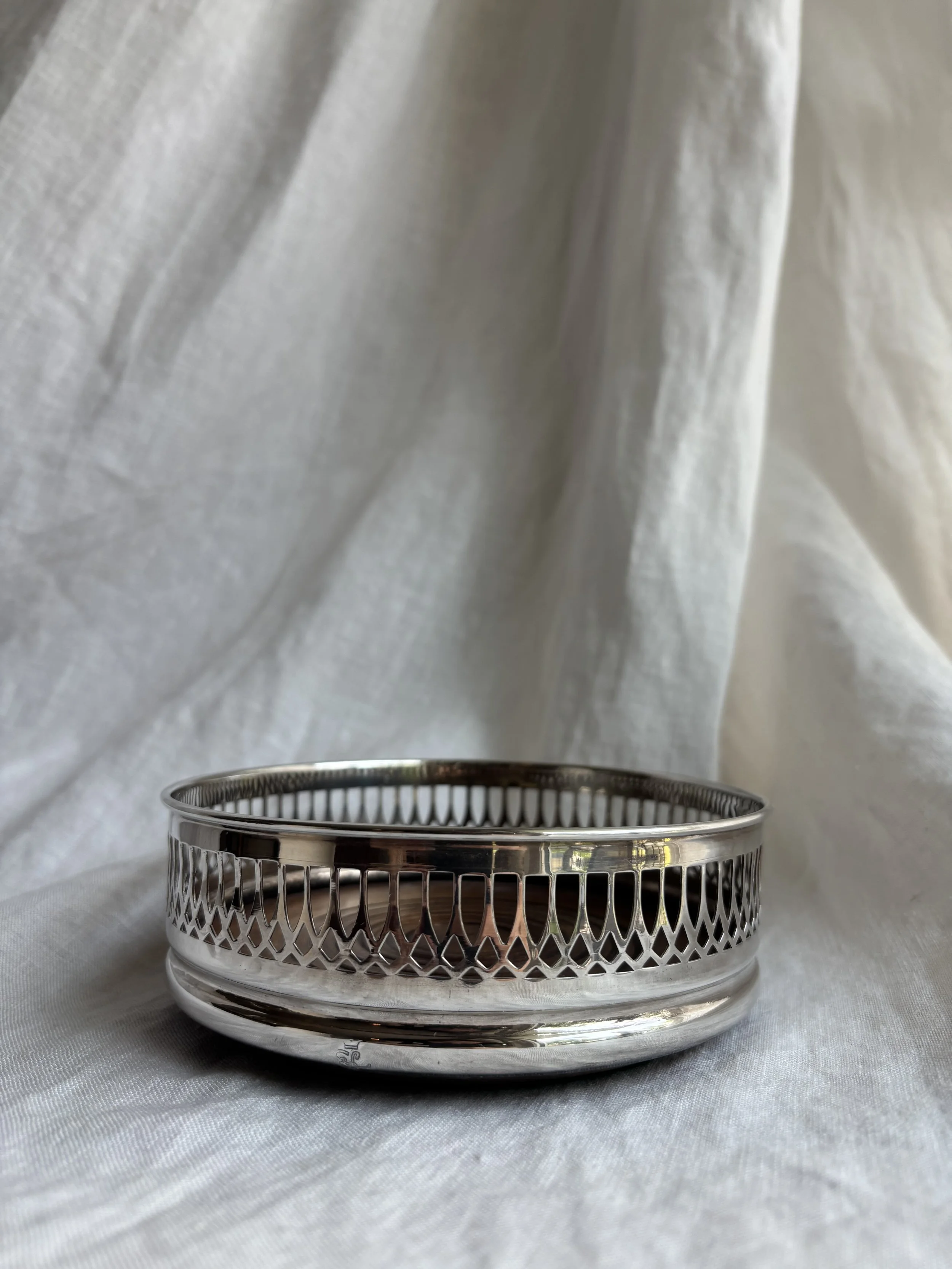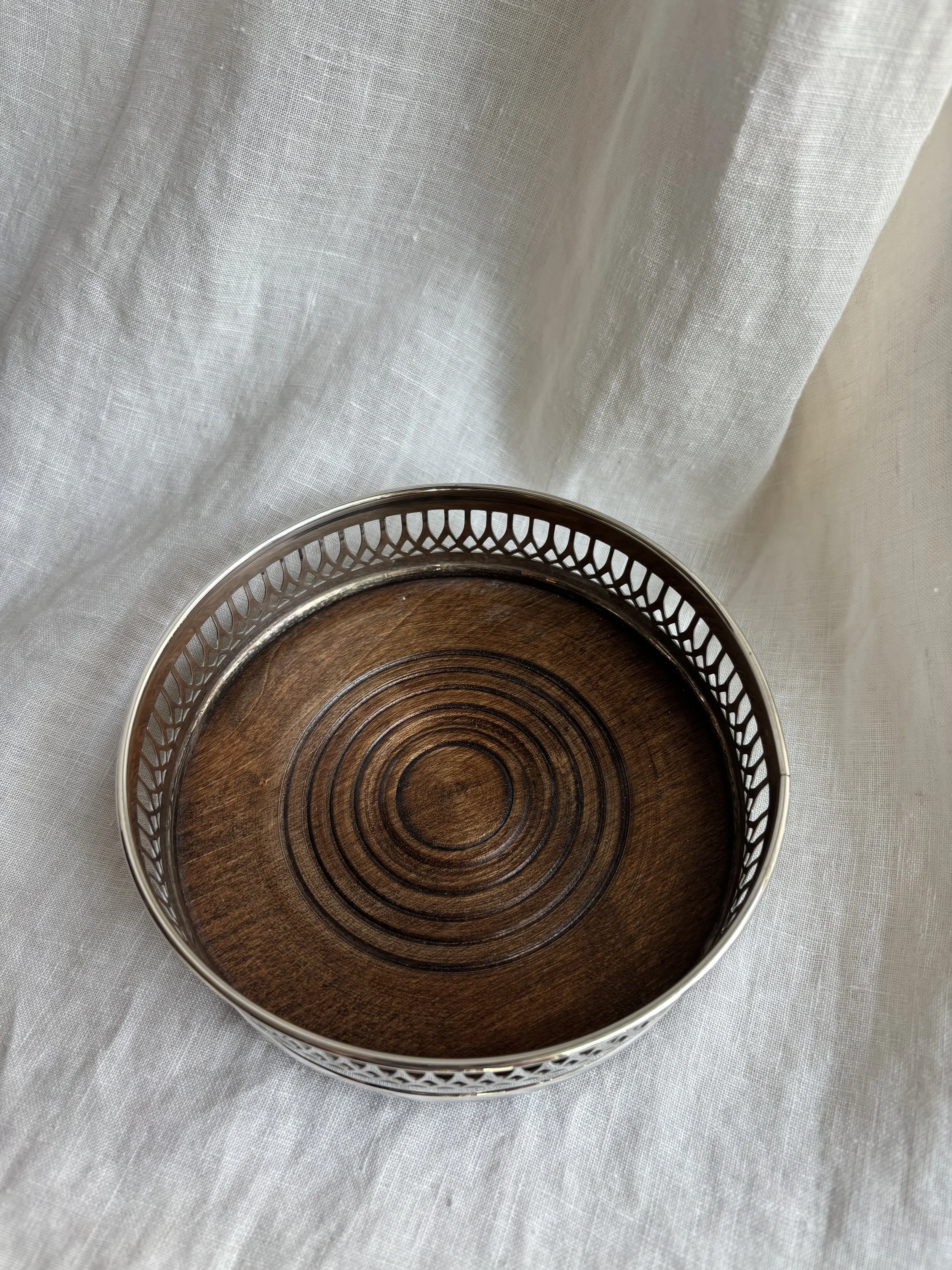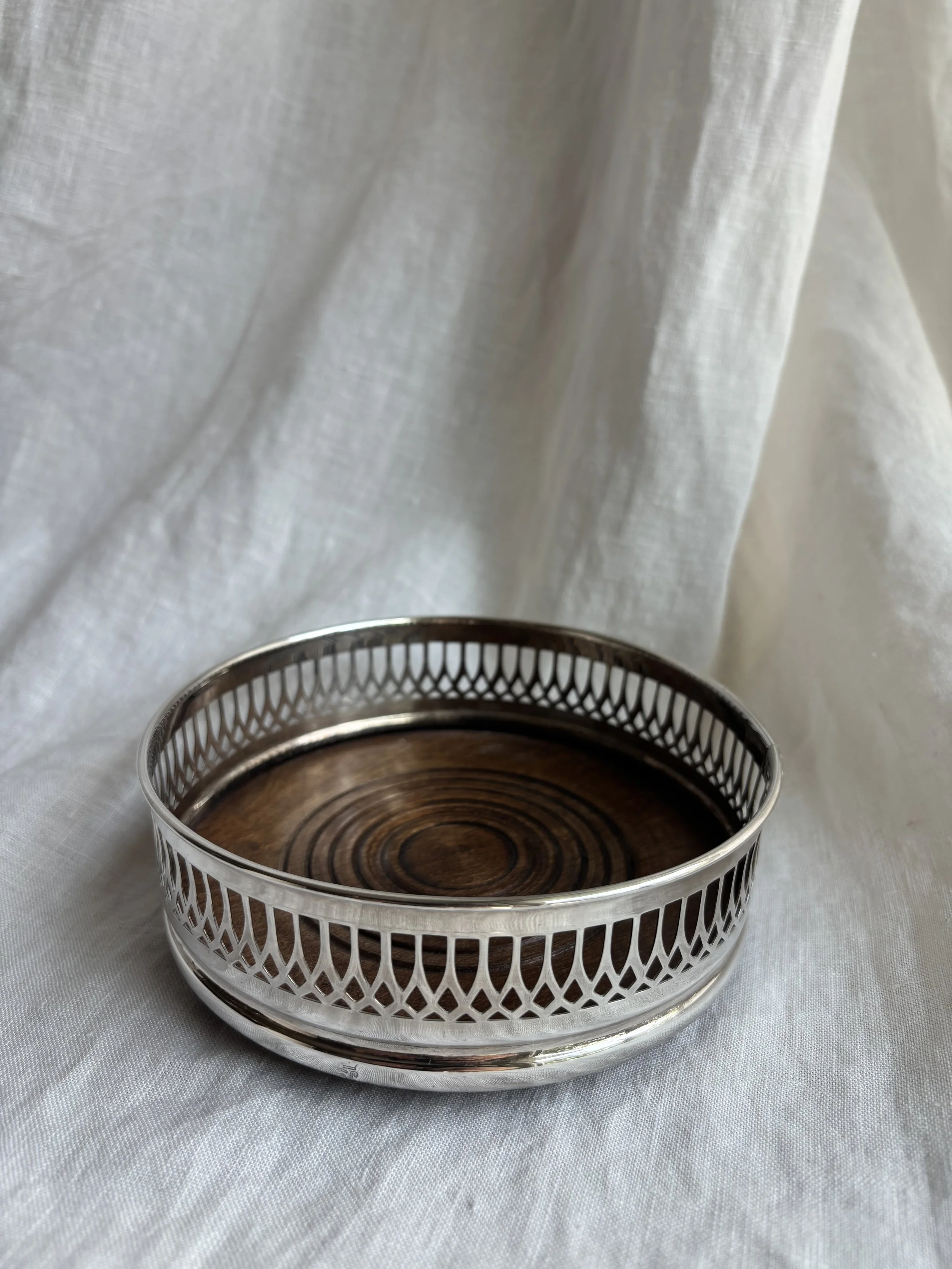 Charming bottle coaster featuring pierced rim in silver plate and turned wooden base. Made in England.