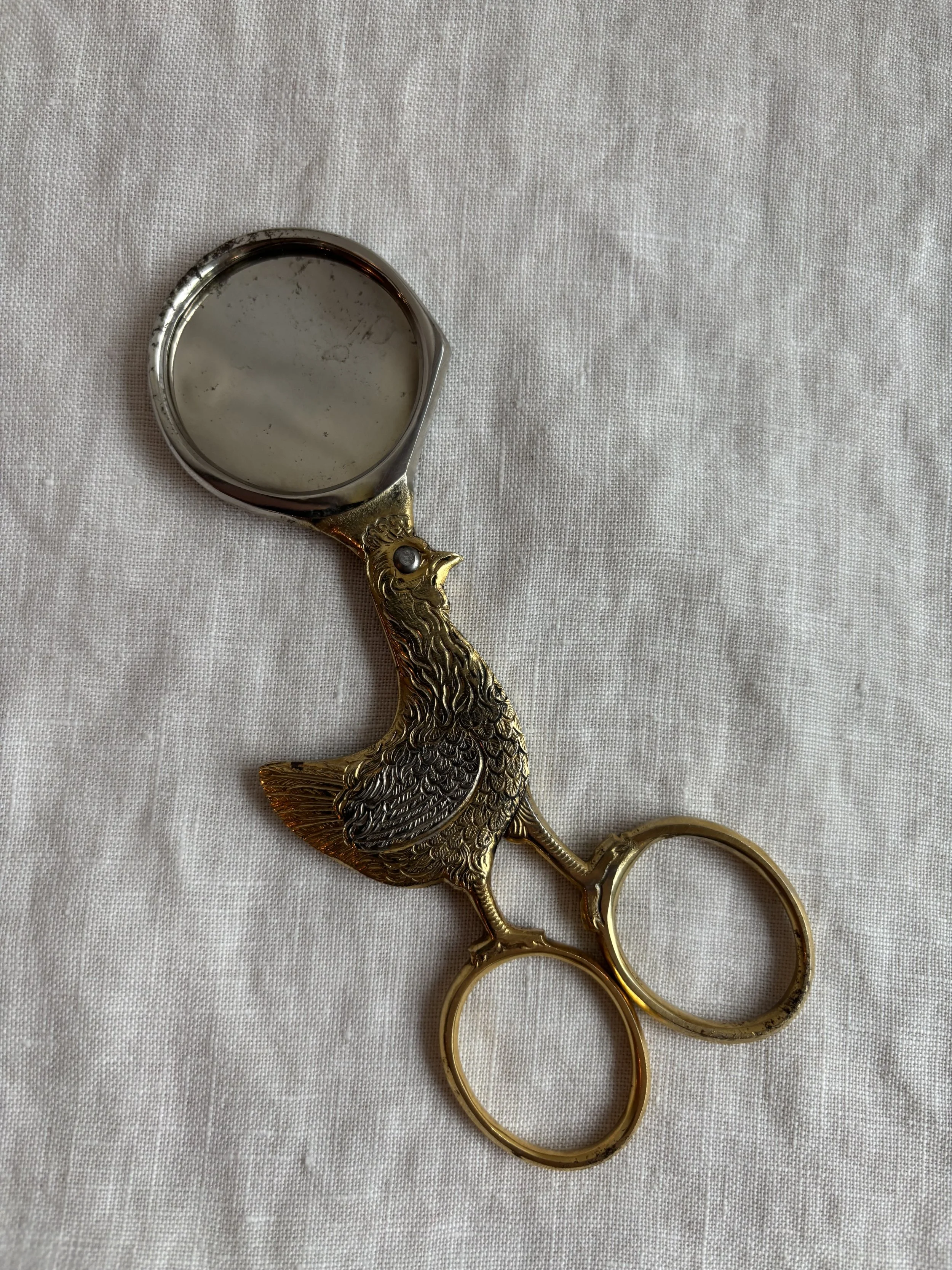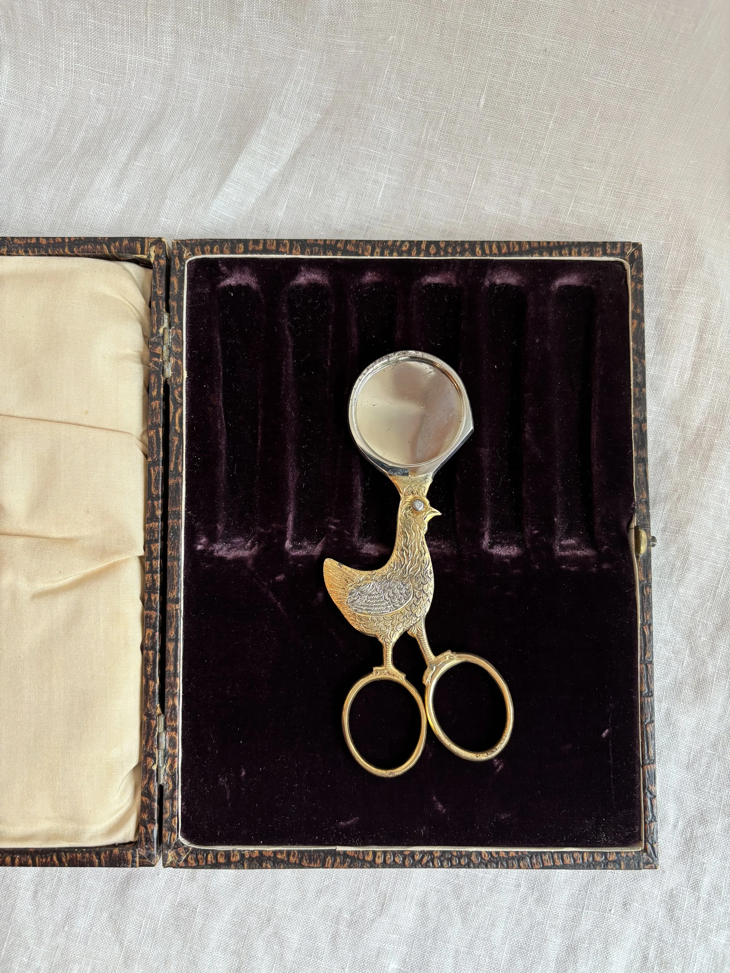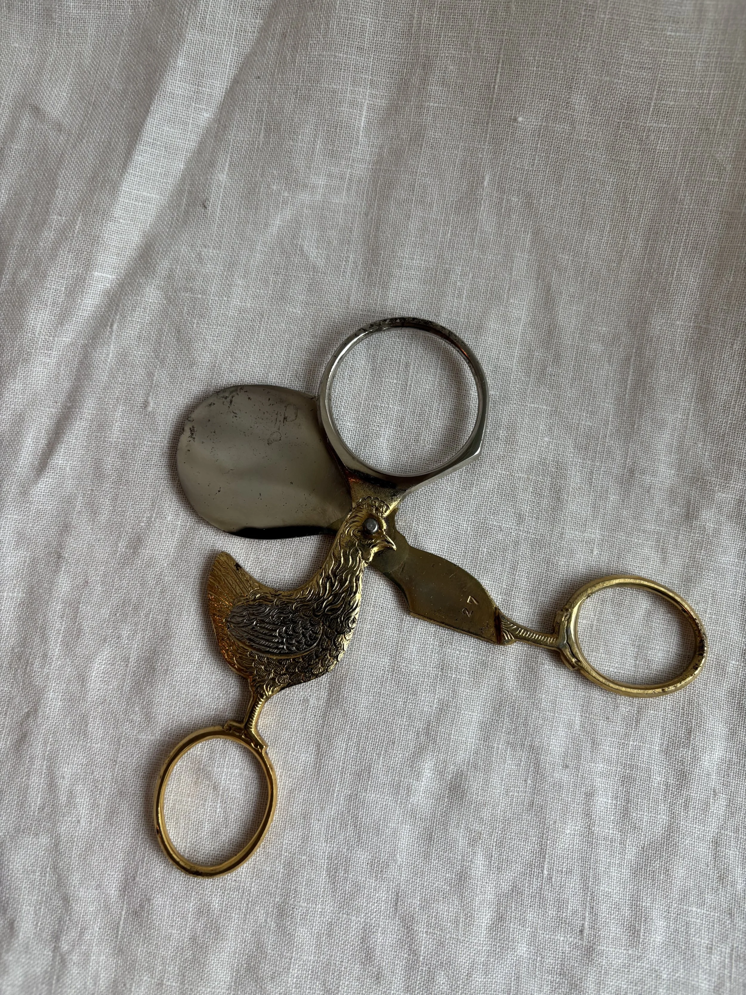 Charming egg cutter in a hen motif in tones of silver and gold and featuring lovely hen detail as handle. Perfect vintage patina. Made in Germany.