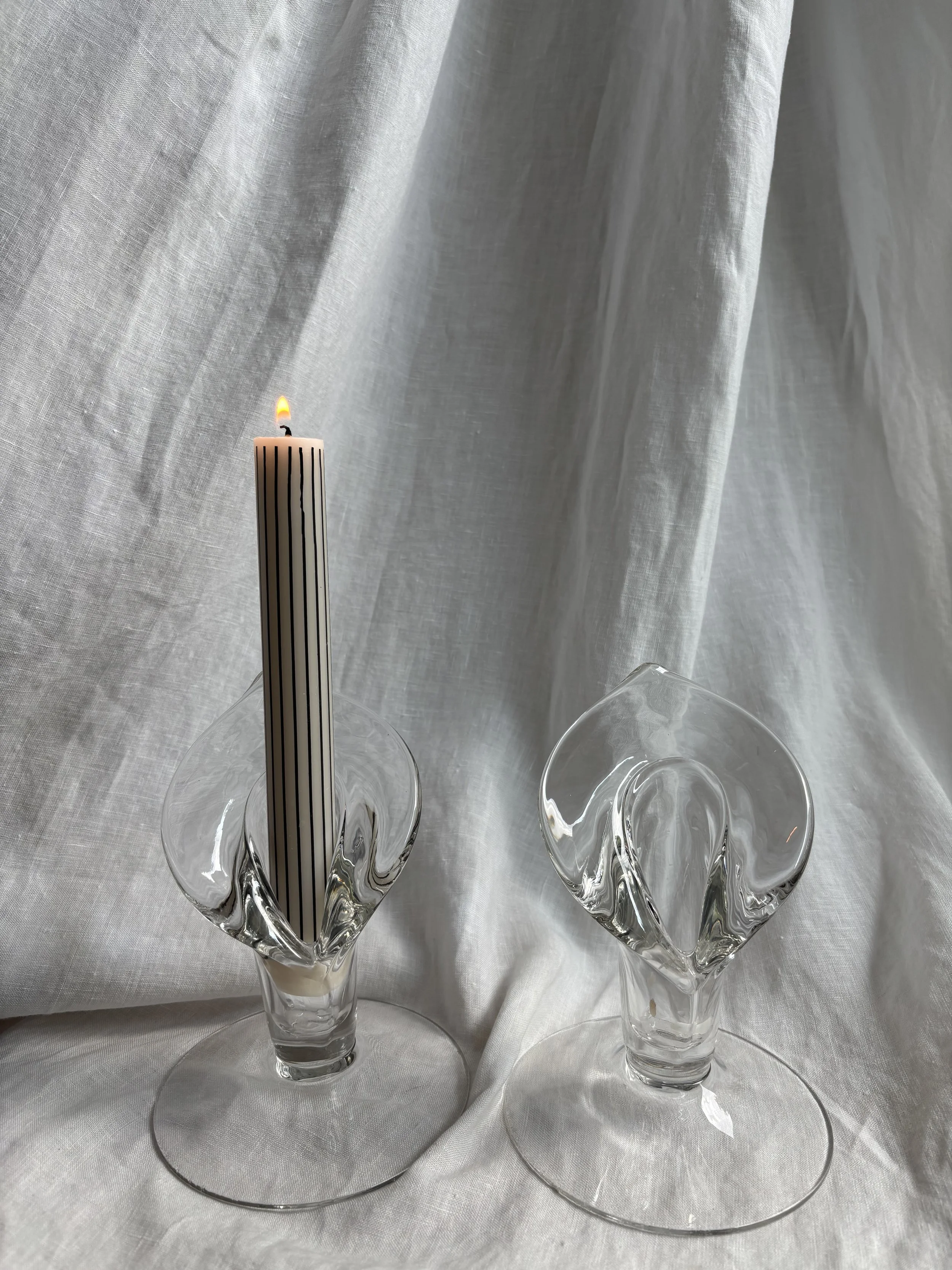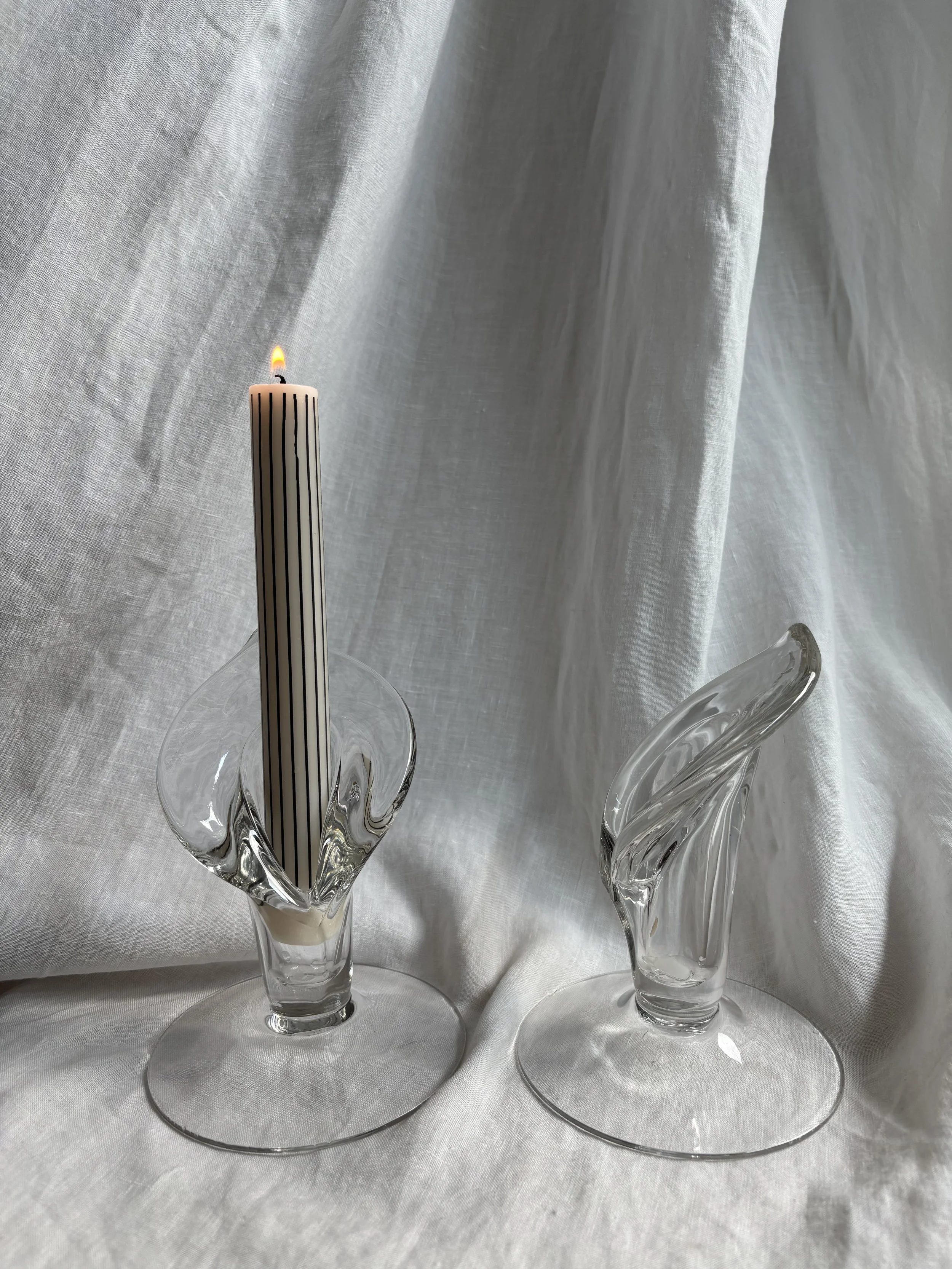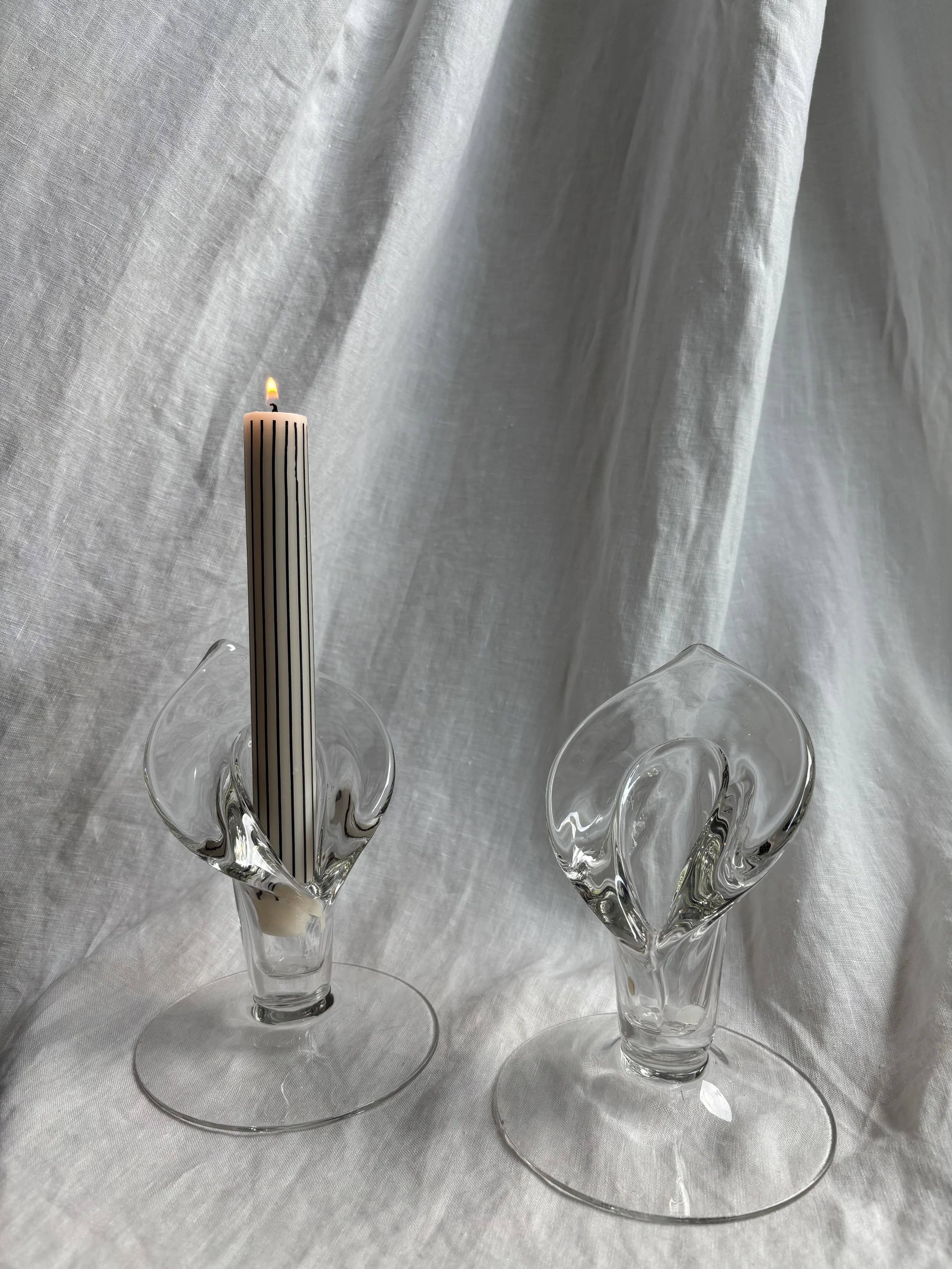 Beautiful pair of candle holders in glass featuring a cala lily motif and large round bases.