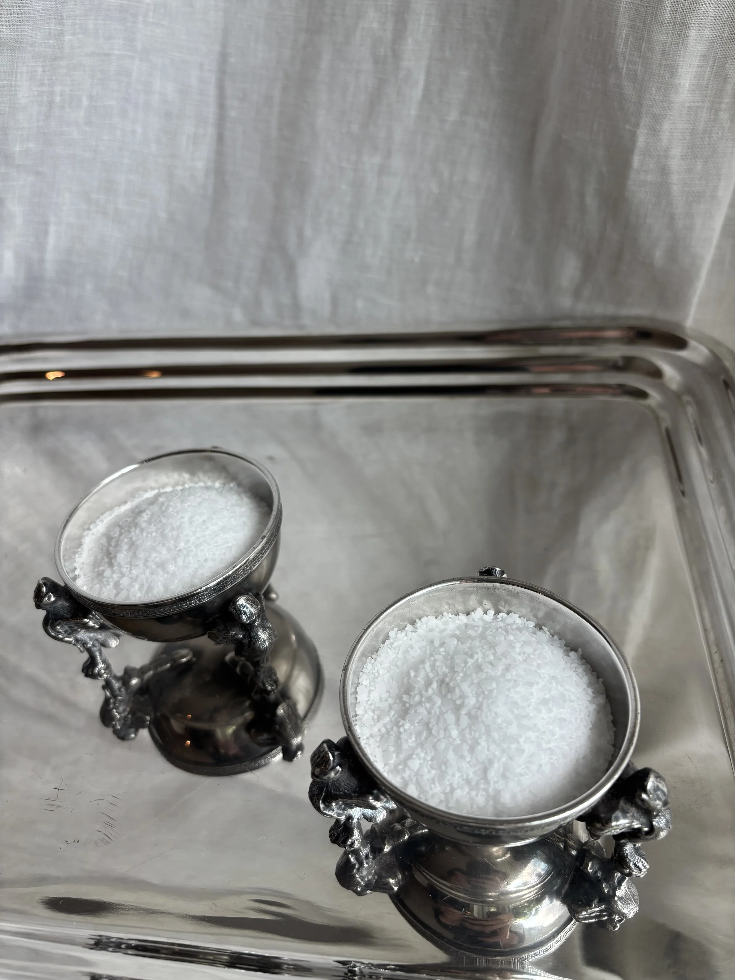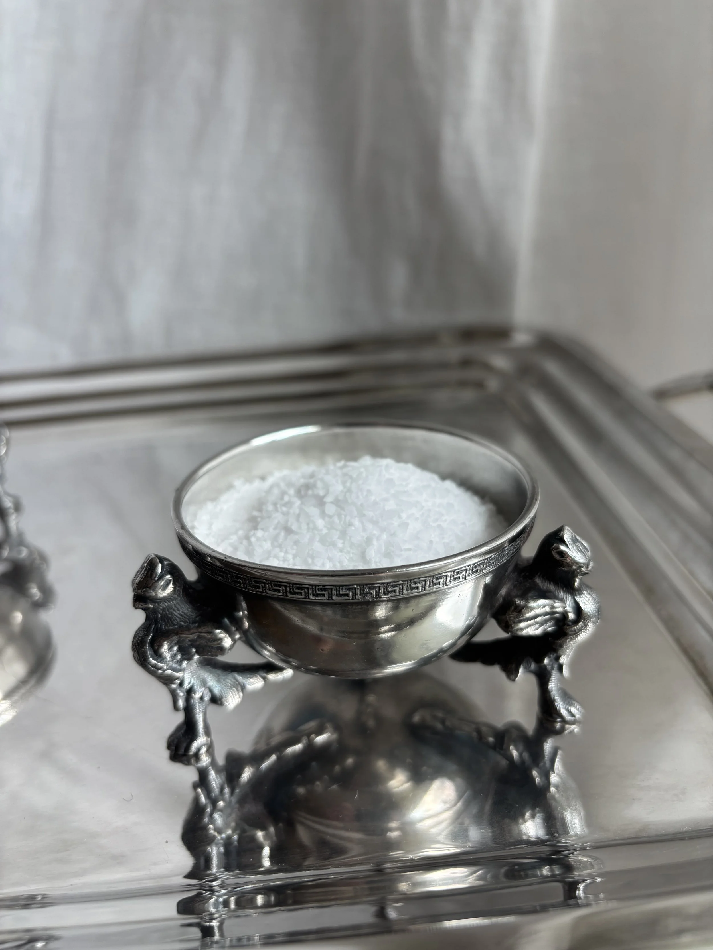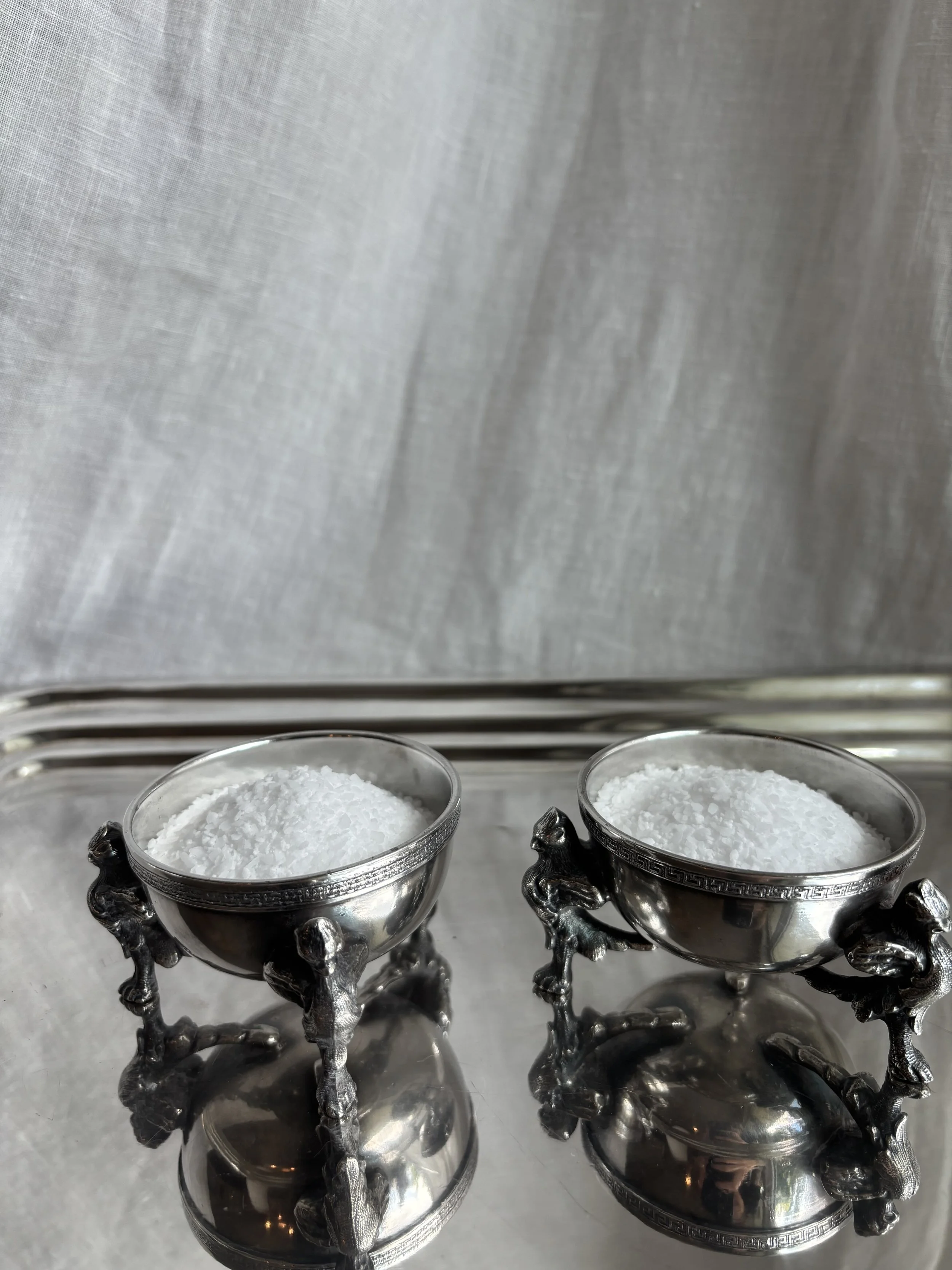 Gorgeous pair of antique salters in silver plate featuring greek key detail at rims and three griffins as legs. Made in England.