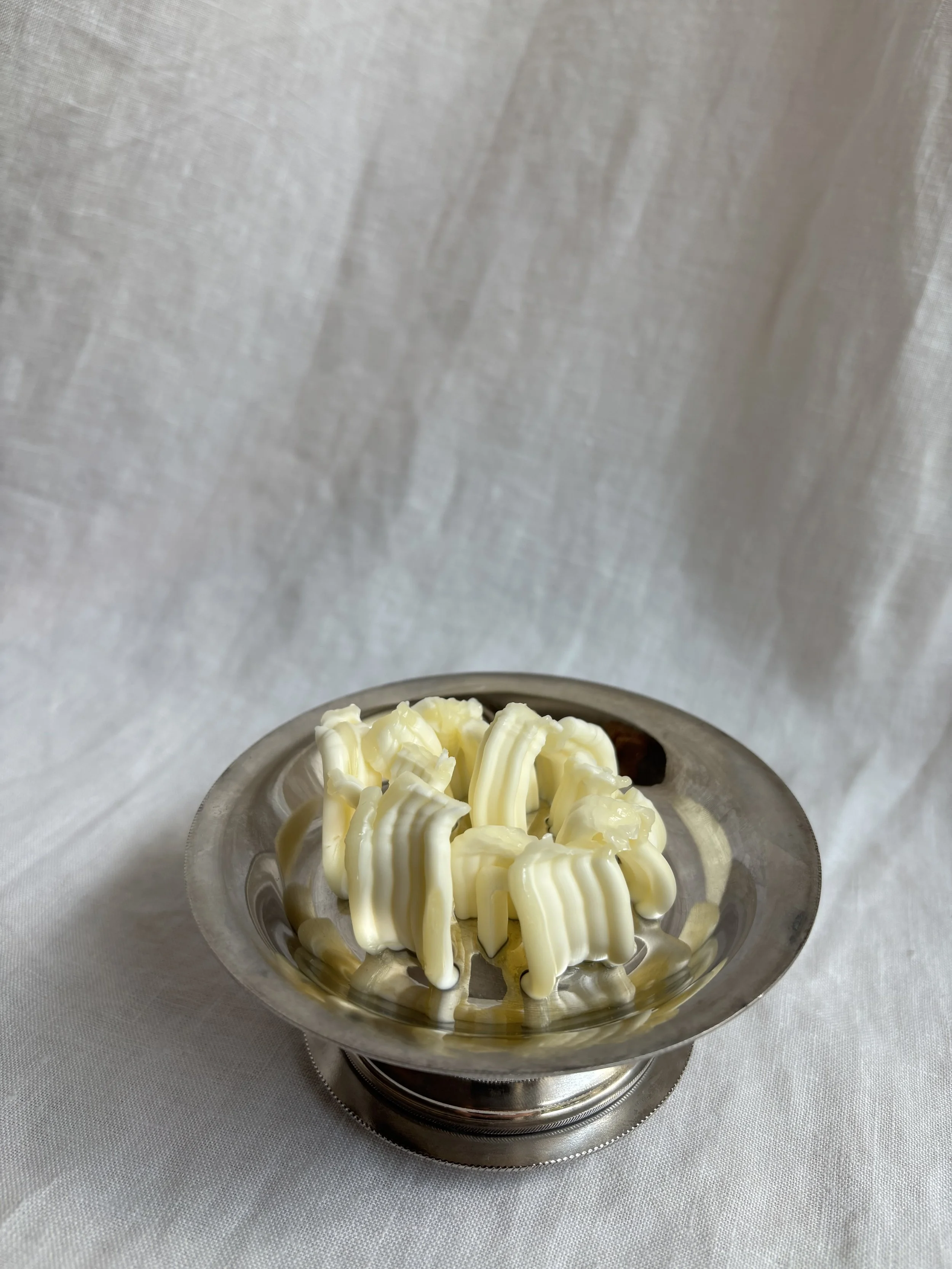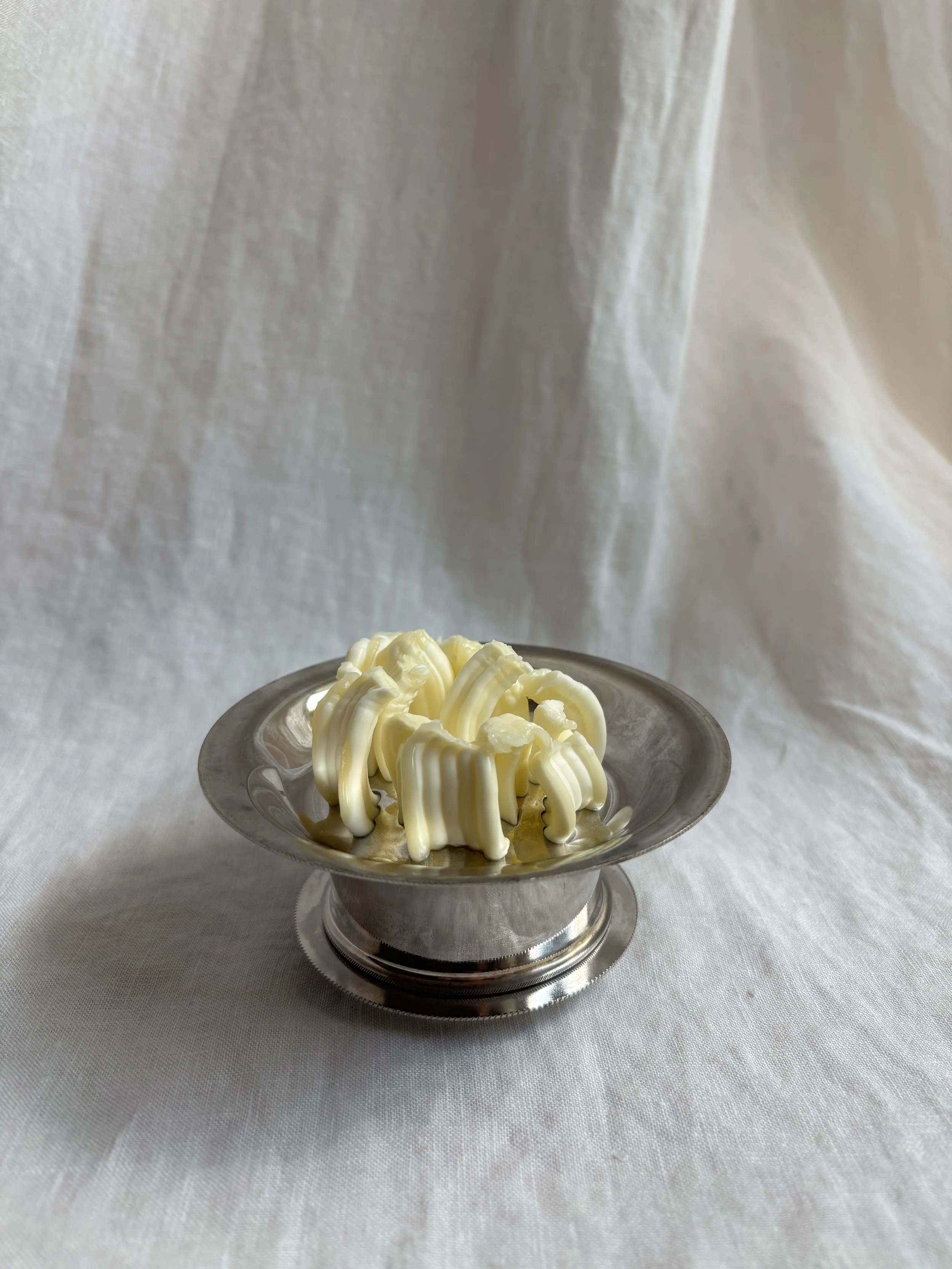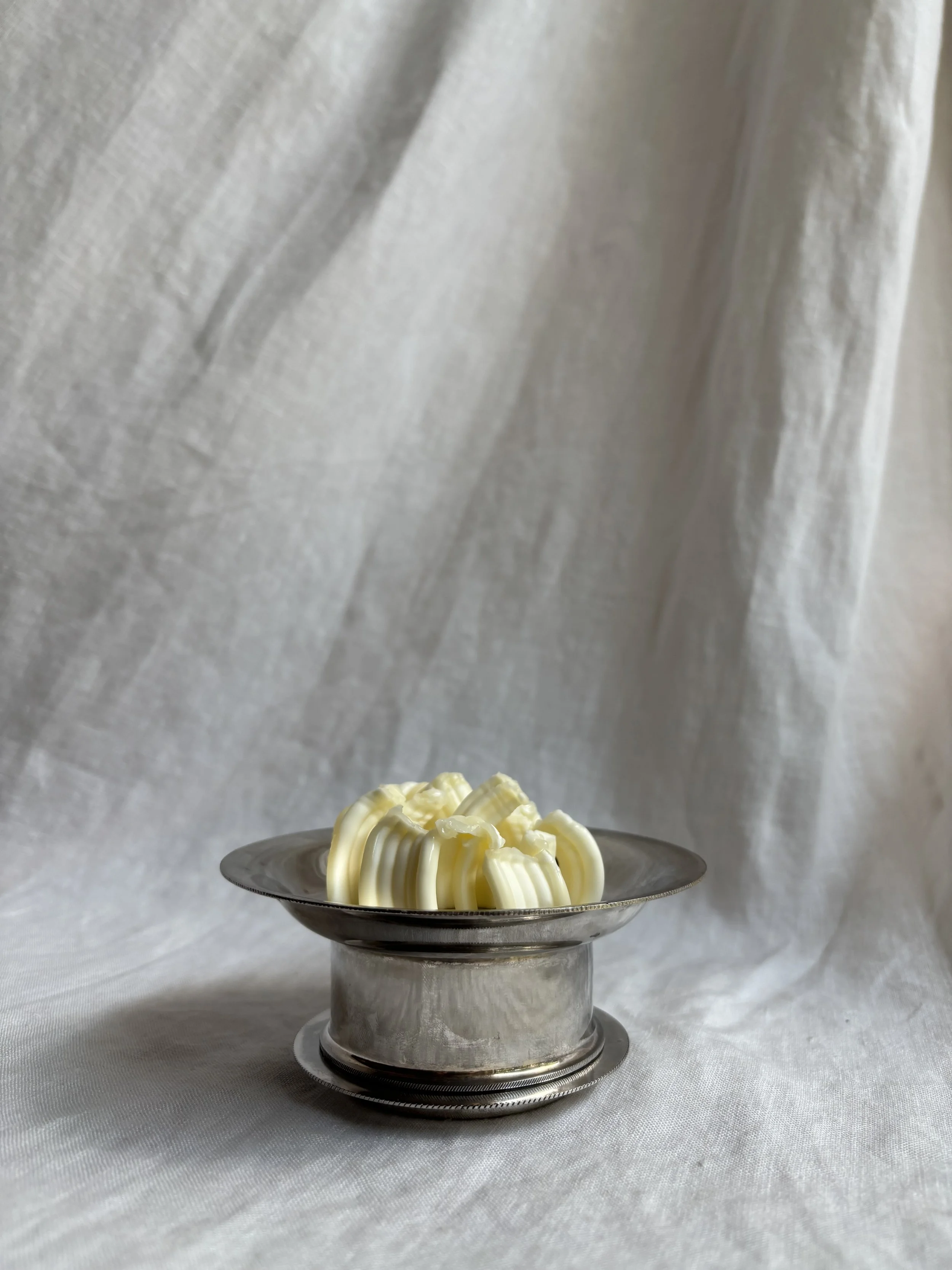Wonderful vintage butter curler in silver plate featuring scalloped openings for butter to unfurl though when pressed and an open base for ice.