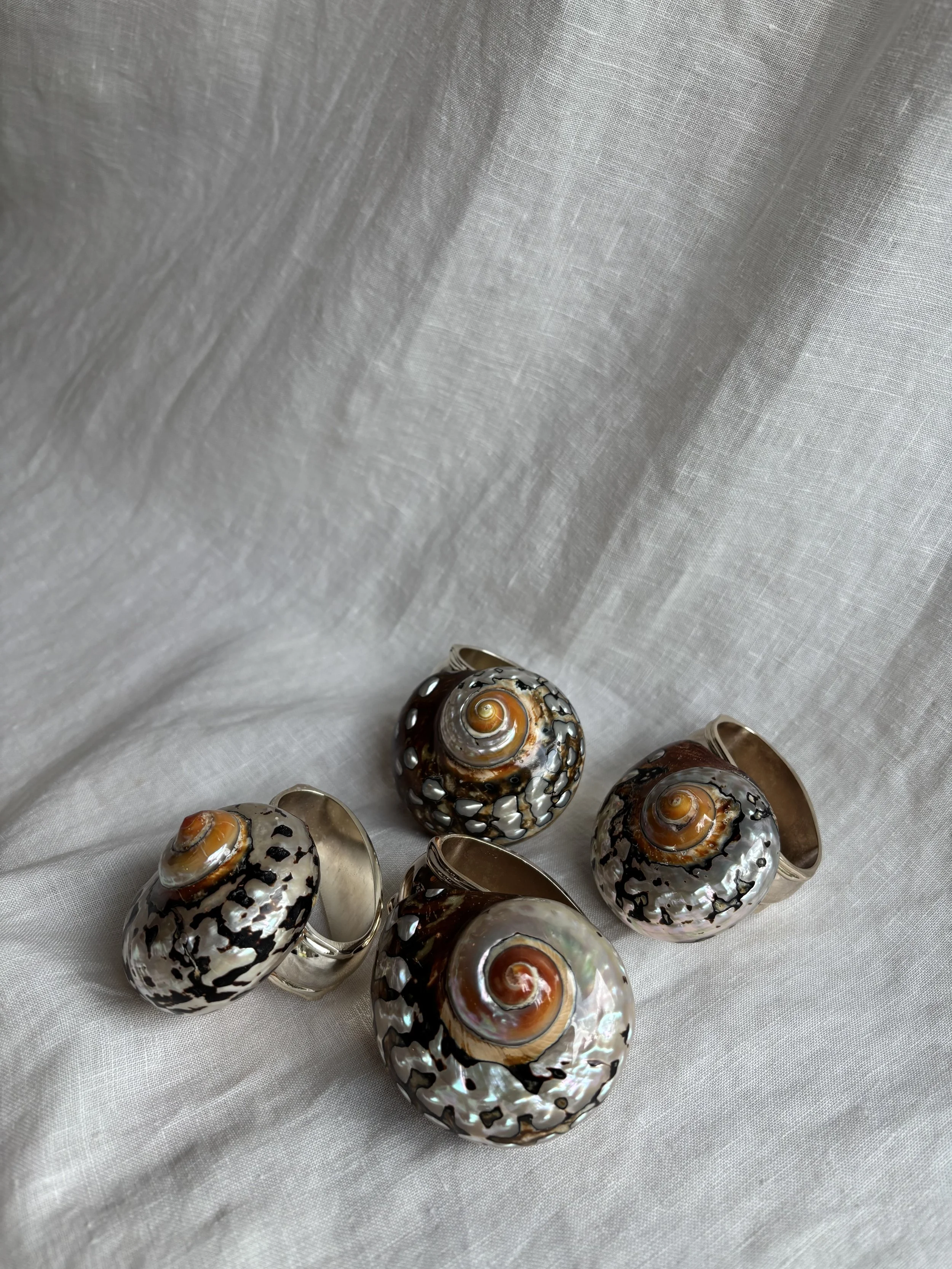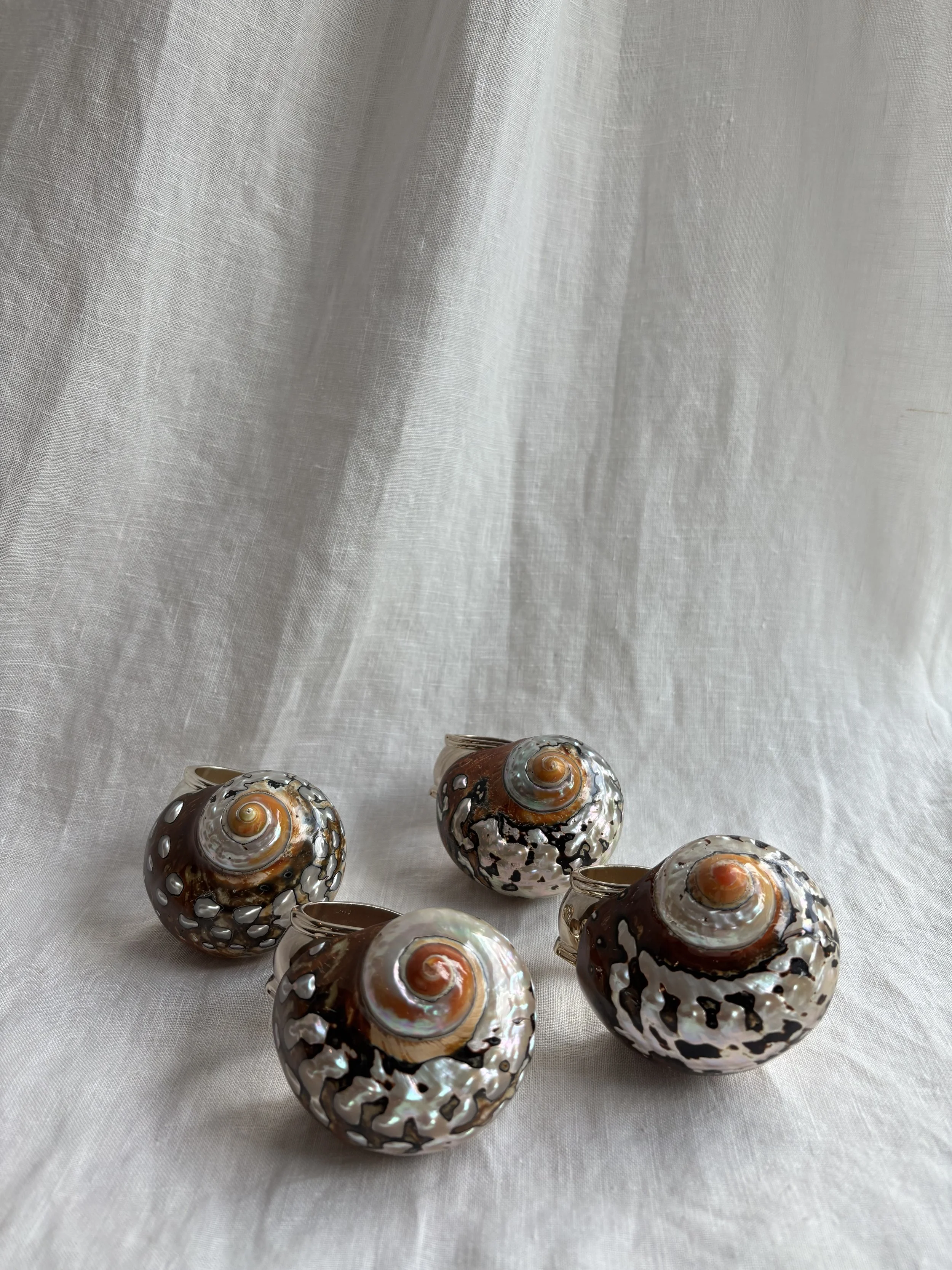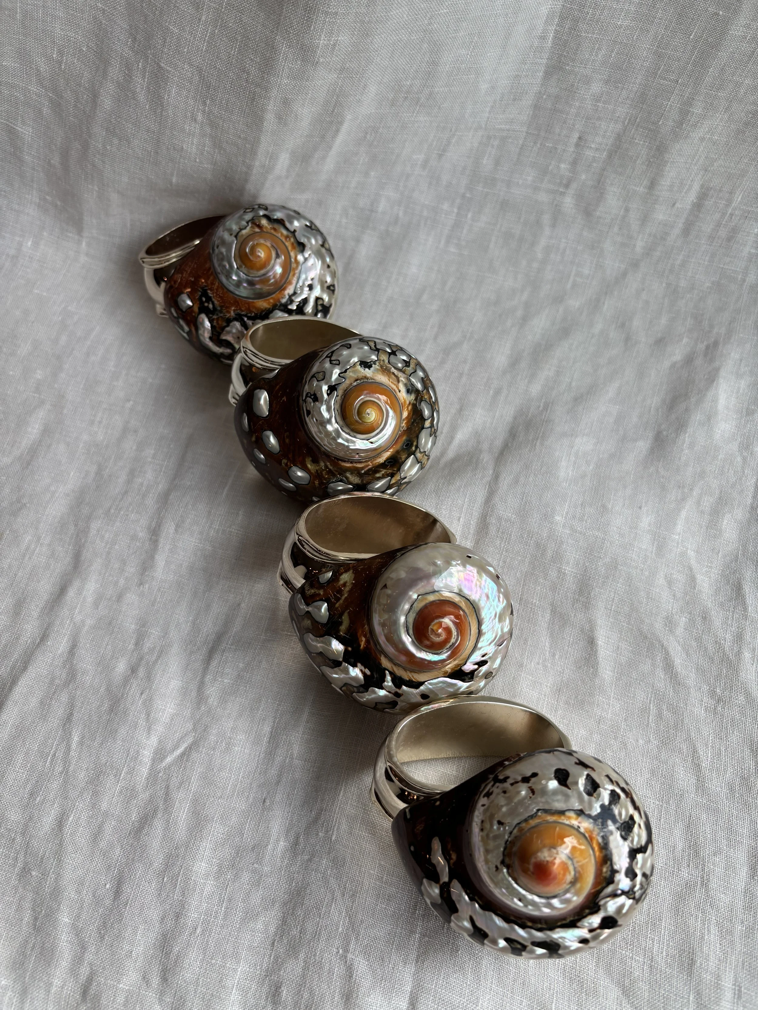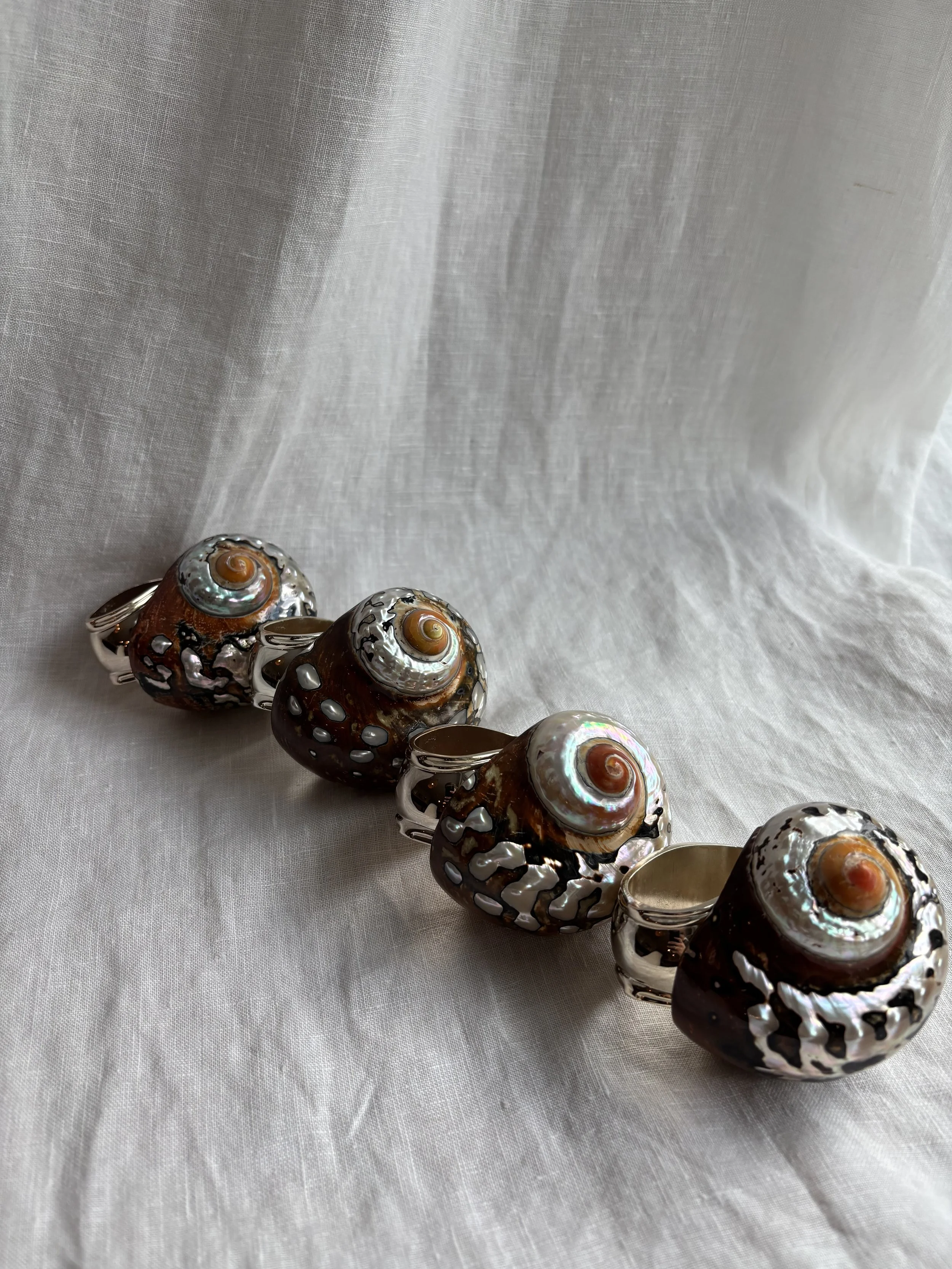 Stunning set of four natural iridescent tiger turbo shell napkin rings featuring silver plated rings.