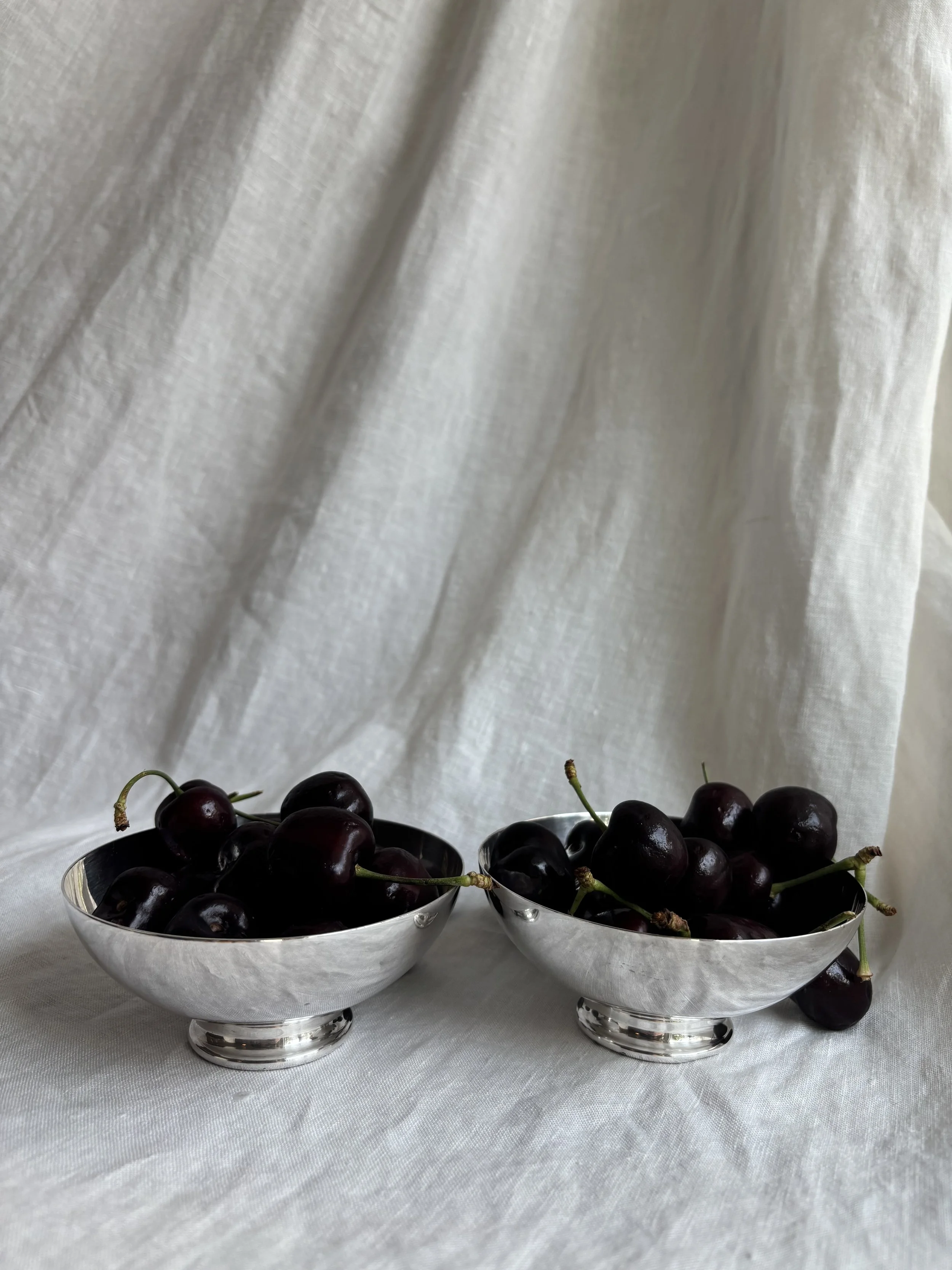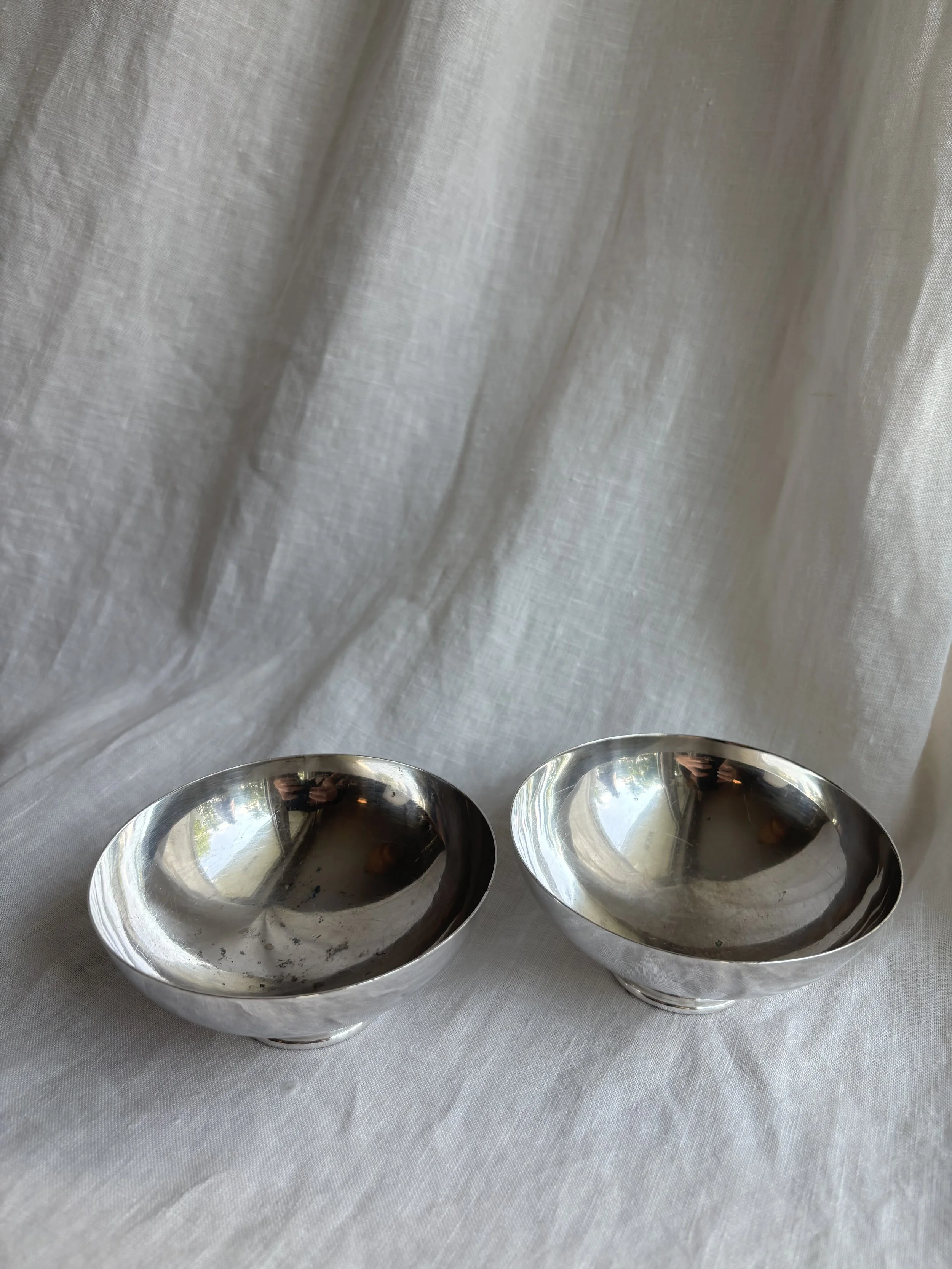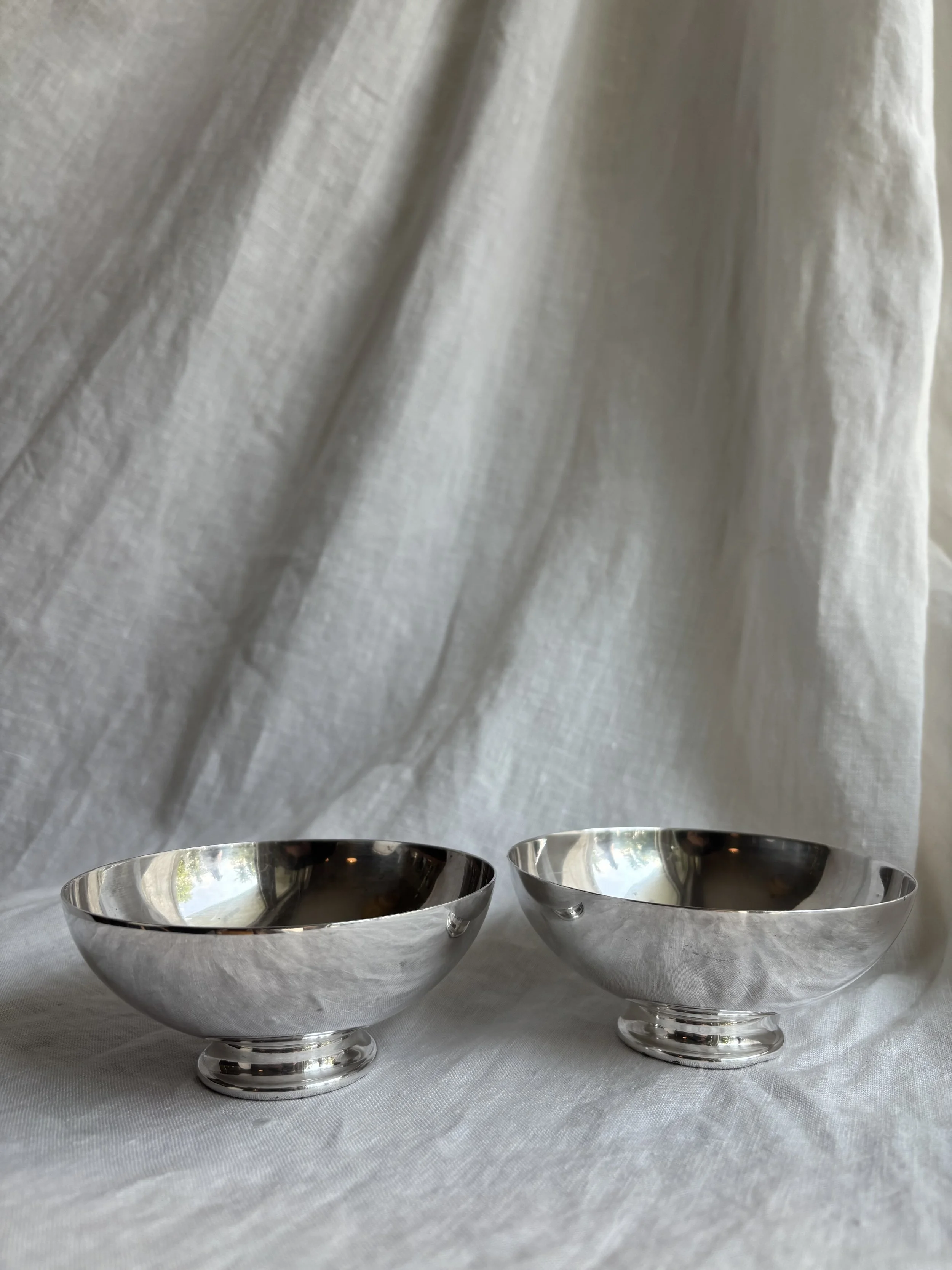 Lovely pair of silver plated bowls featuring petite turned bases, beautifully simple shape and perfect vintage patina.