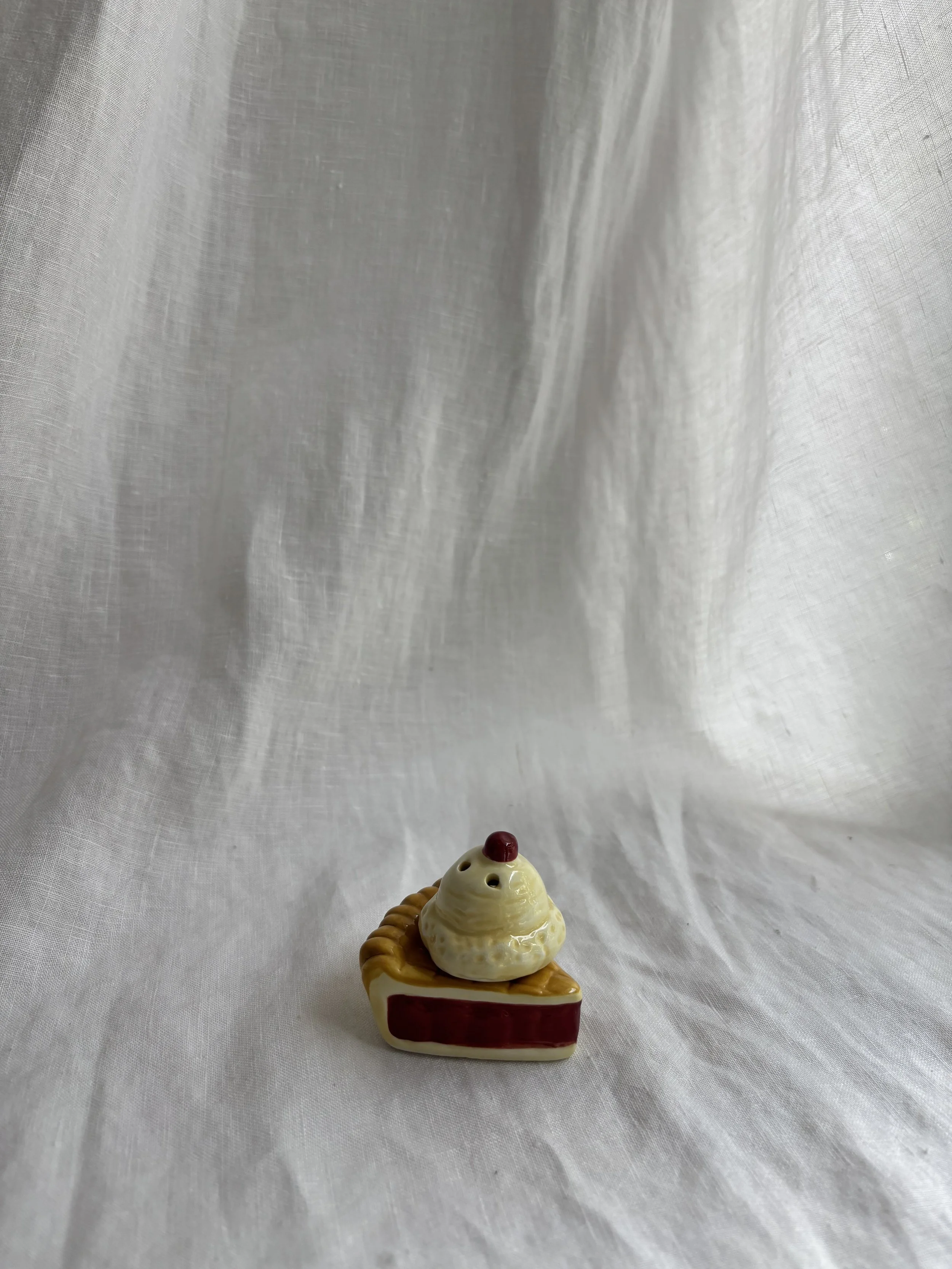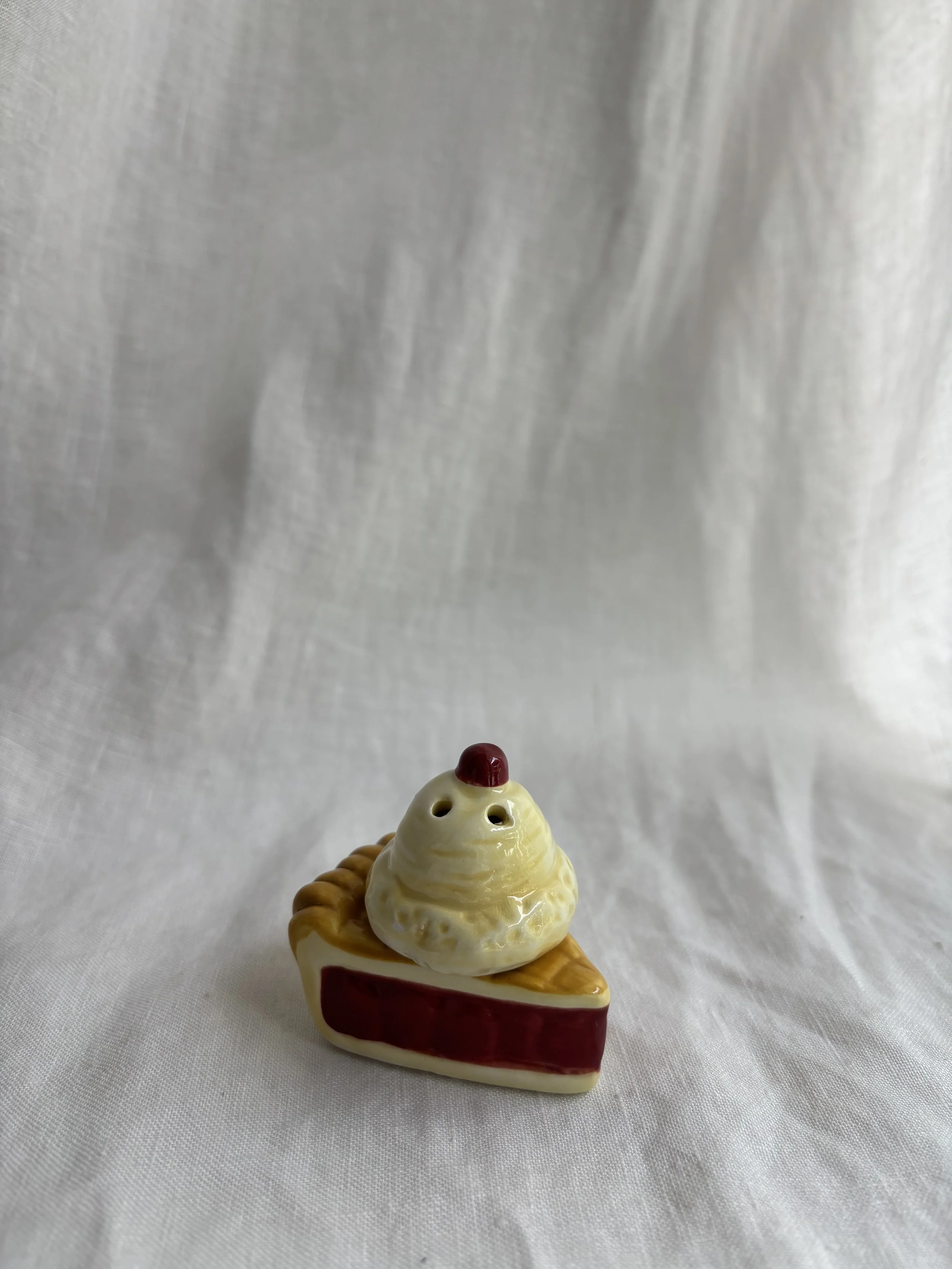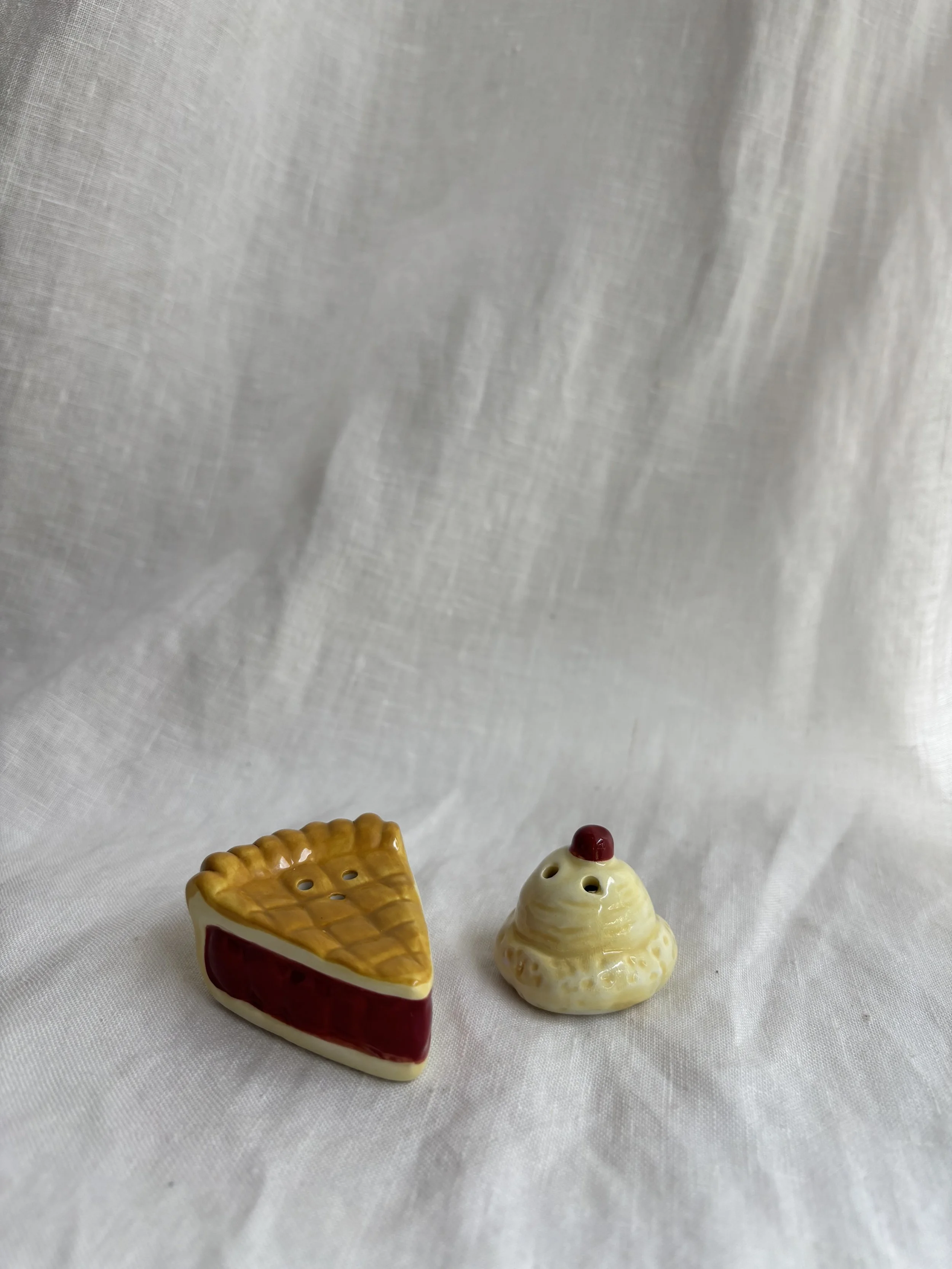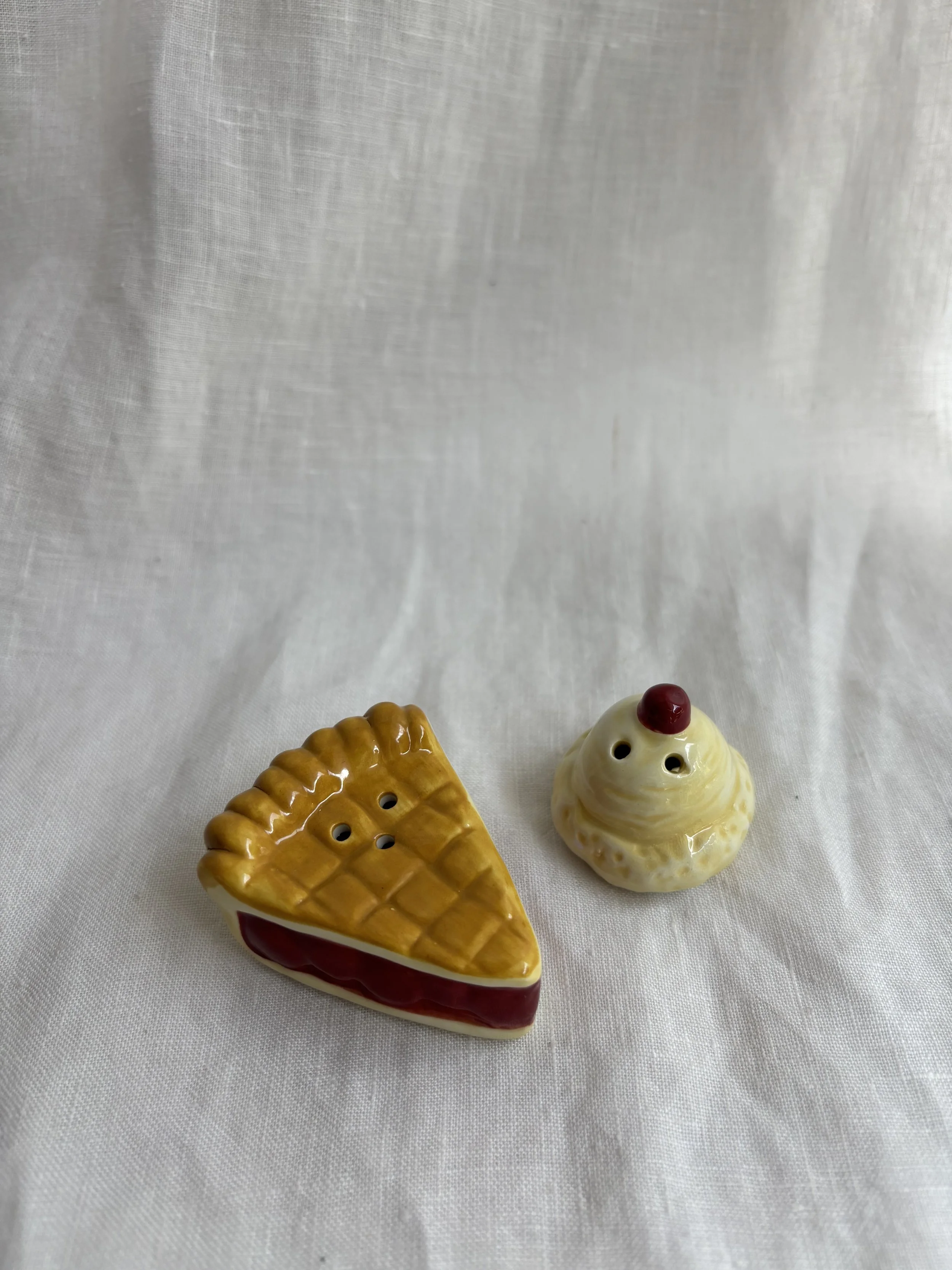 Darling petite ceramic salt and pepper set featuring a pie à la mode motif - the ice cream sits atop the pie.