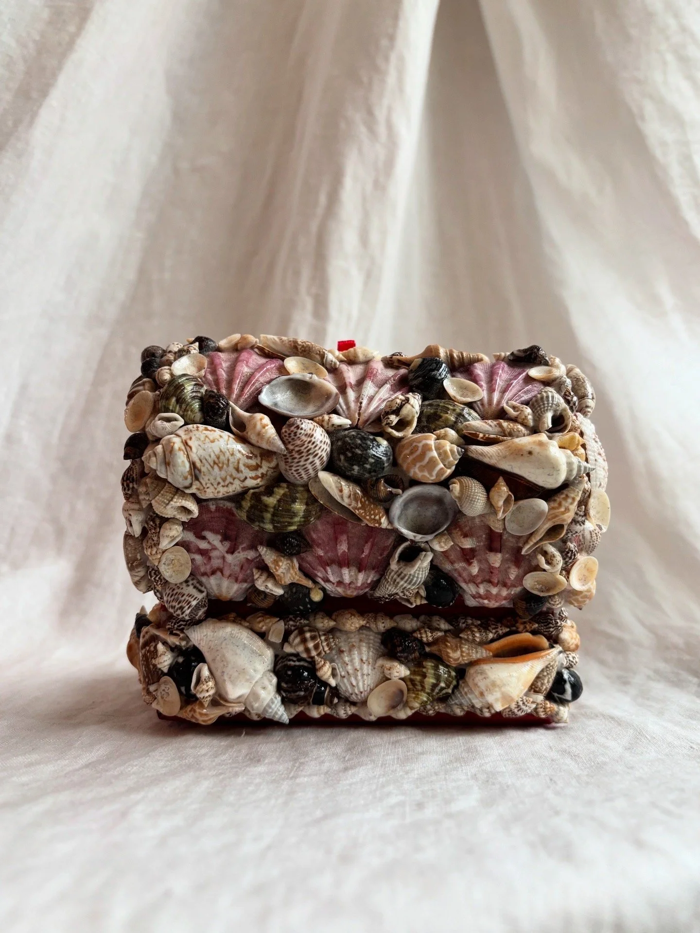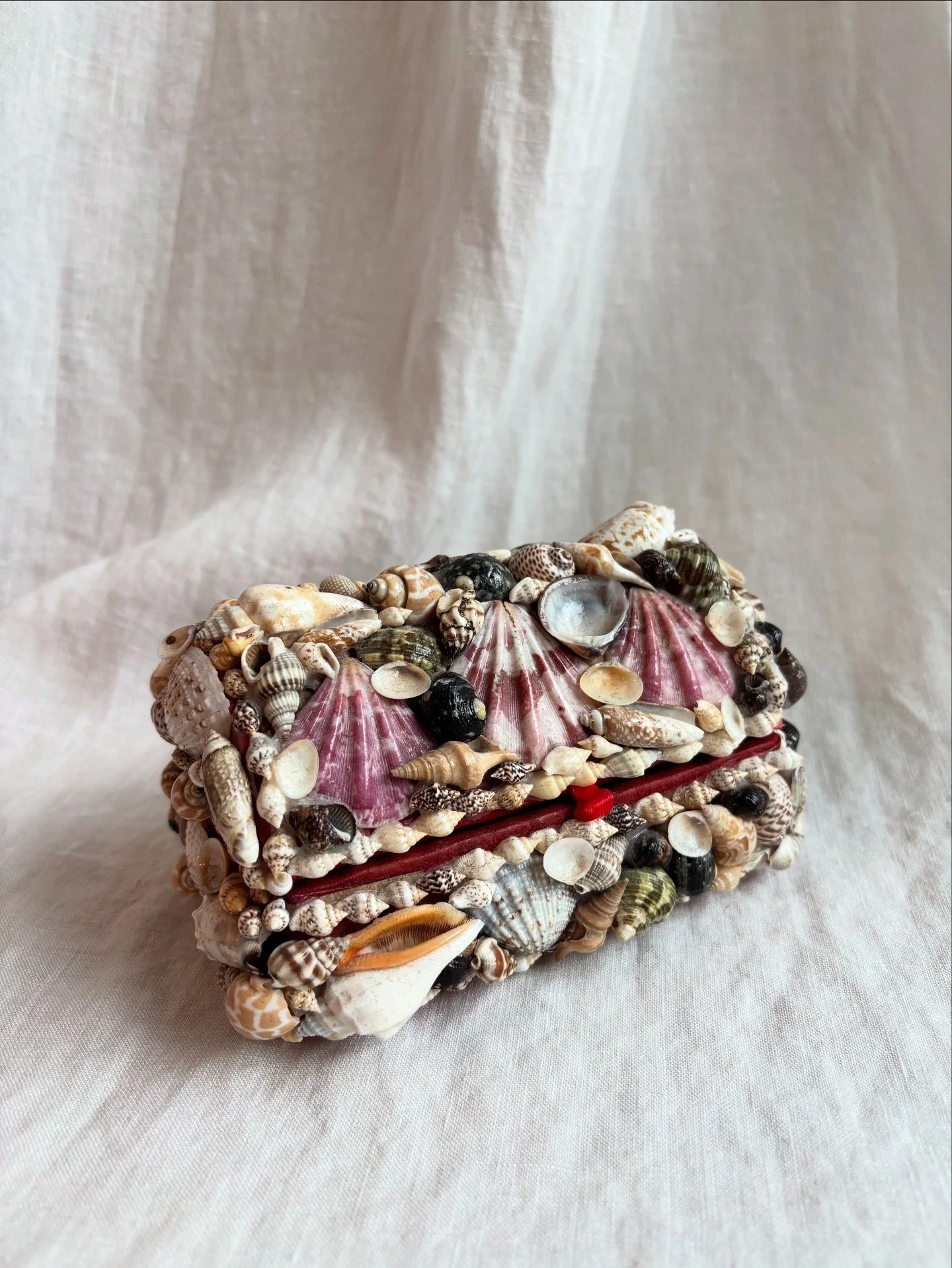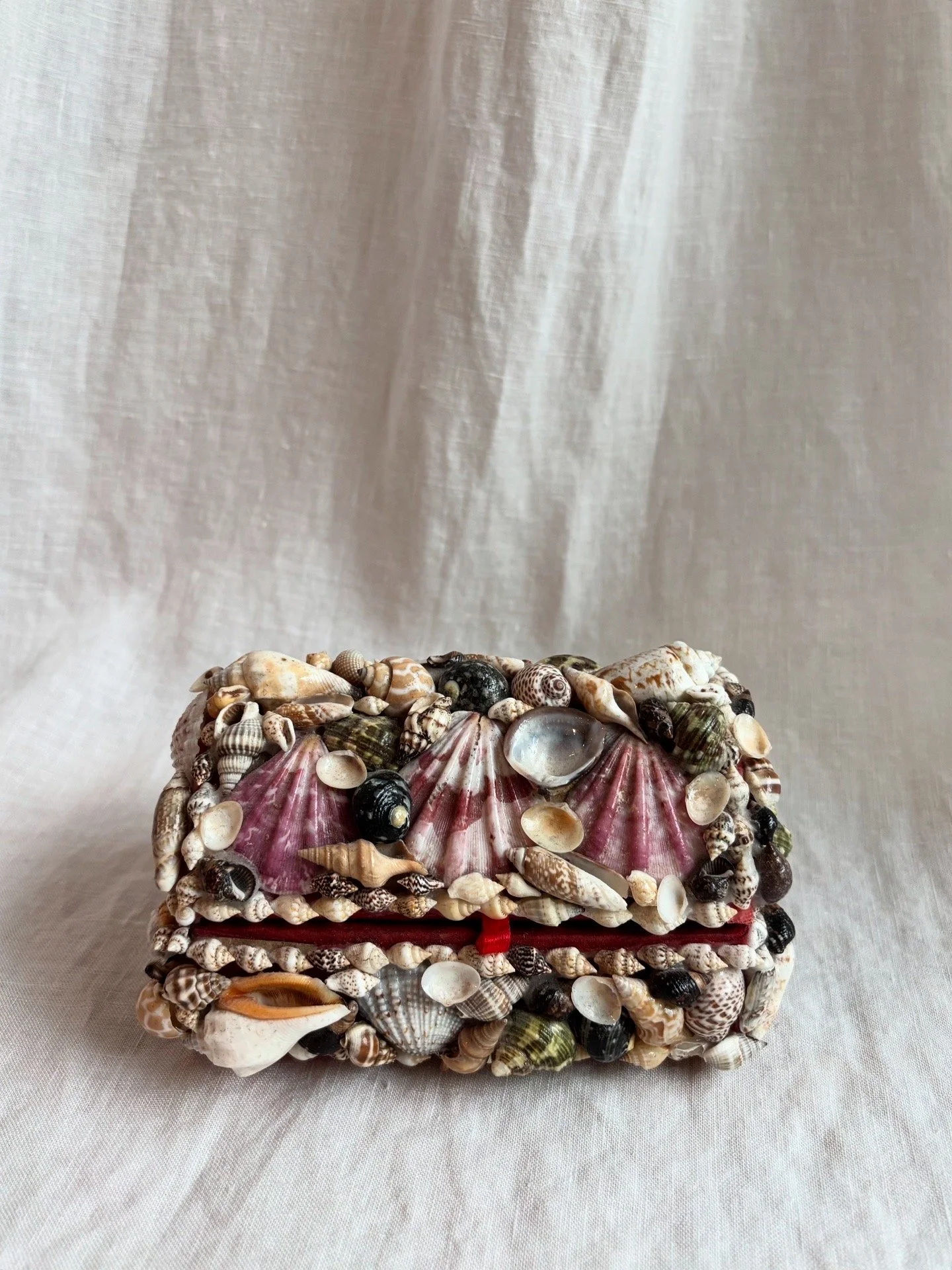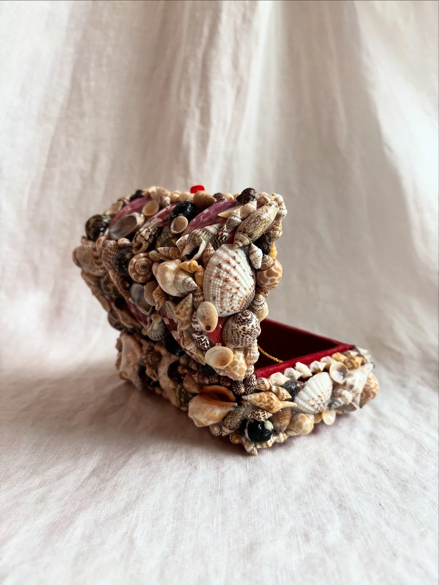 Wonderful natural shell encrusted box featuring a hinged lid, rectangular shape, and red lined interior. Perfect for storing all manner of treasured objects.