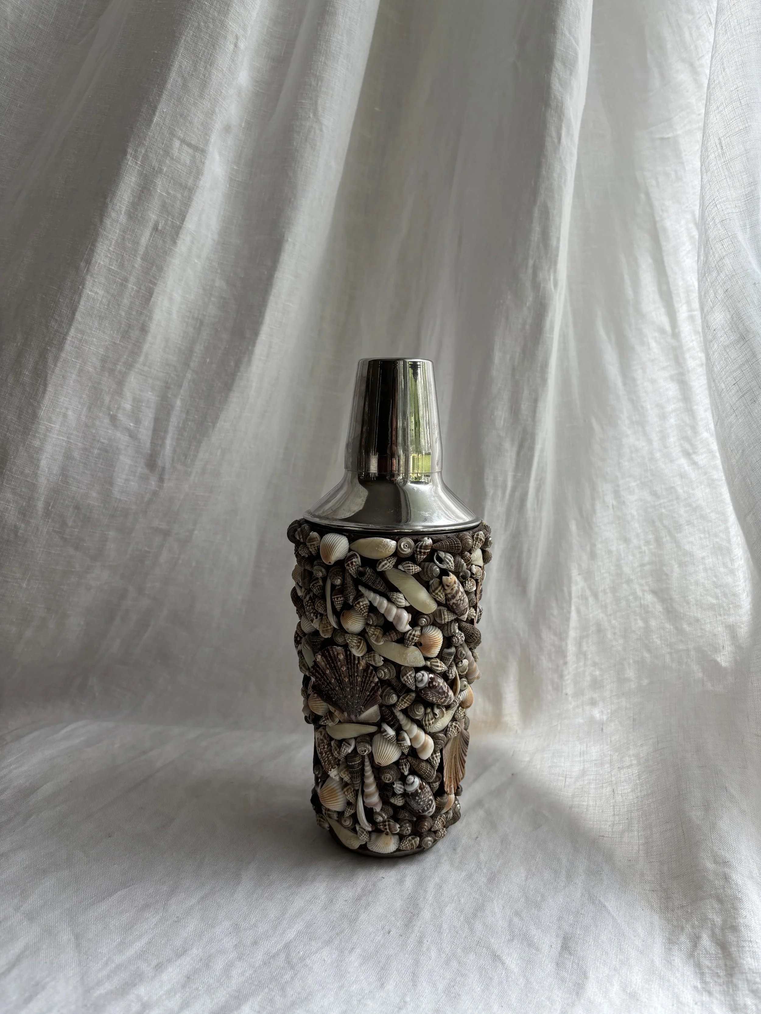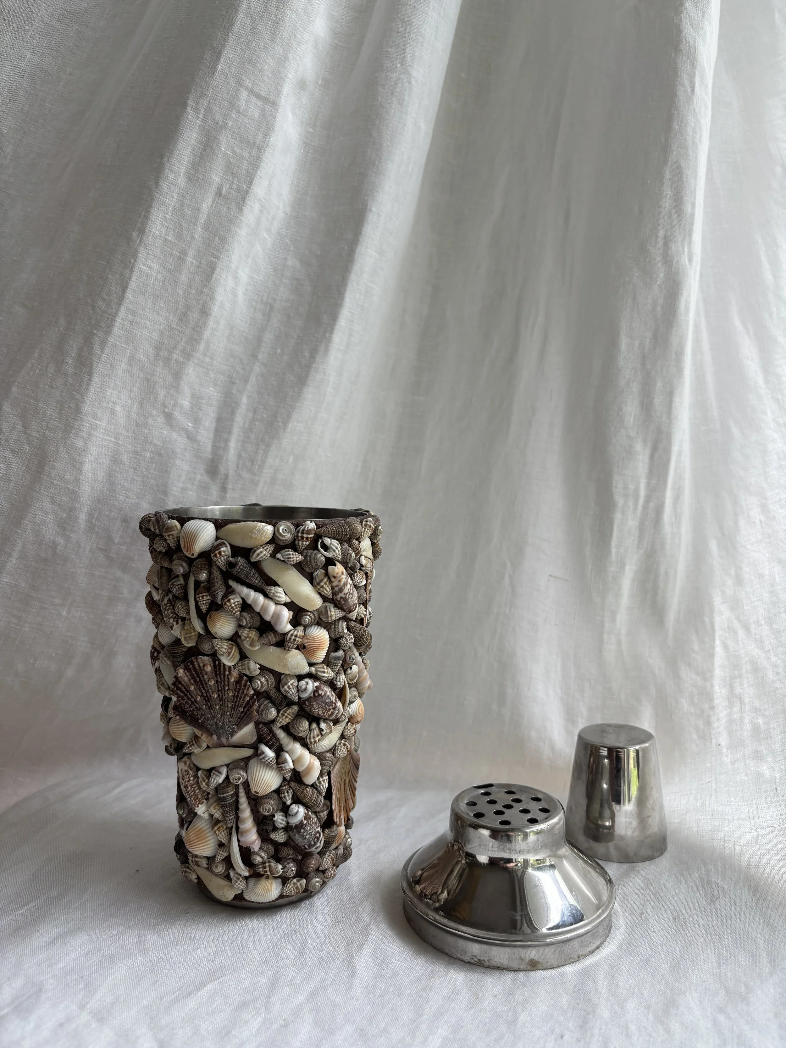 Incredible shell encrusted cocktail shaker featuring lid, strainer, and gorgeous petite natural shells throughout.