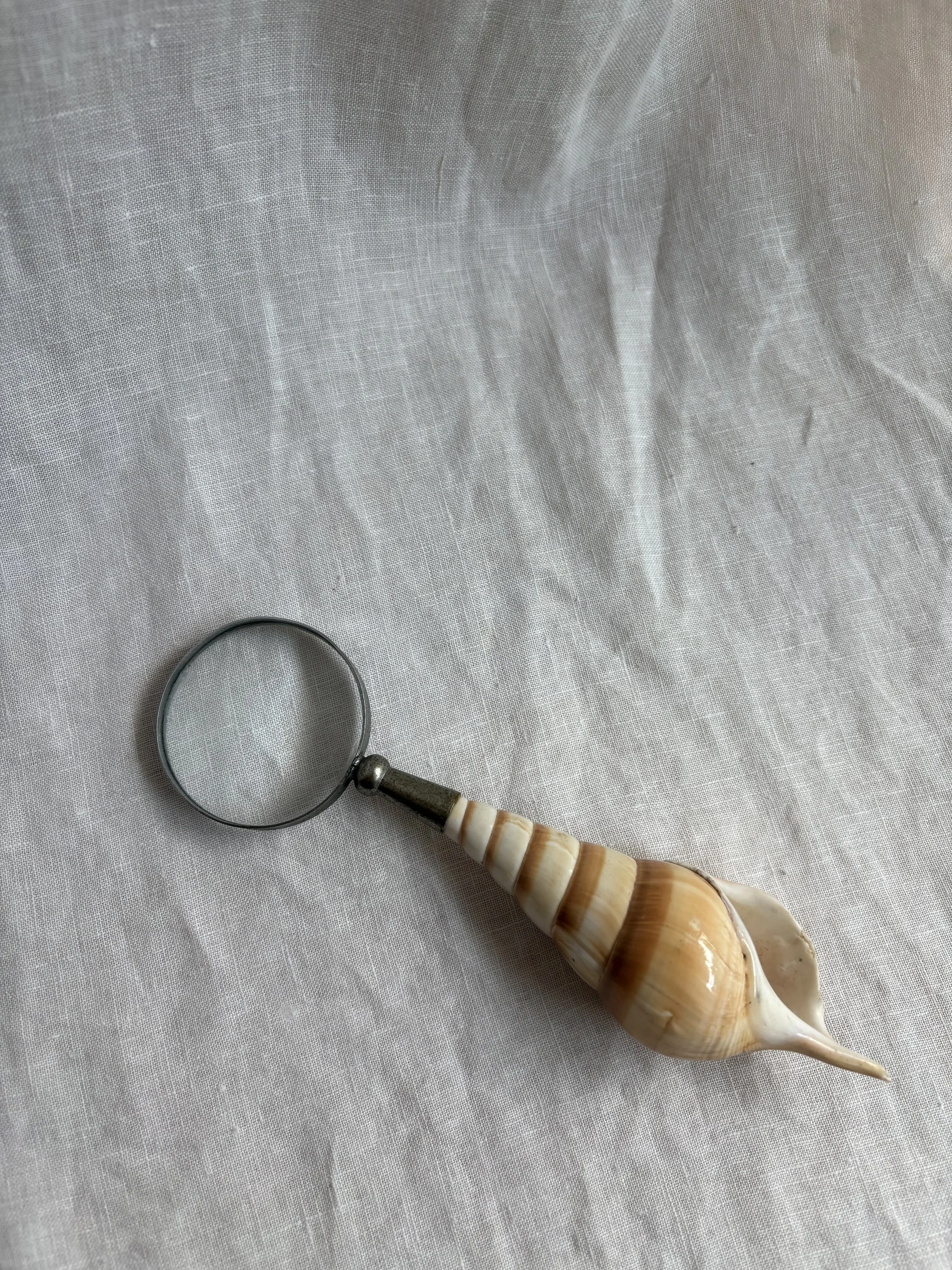 Gorgeous magnifying glass featuring silver tone cuff and natural shell handle.