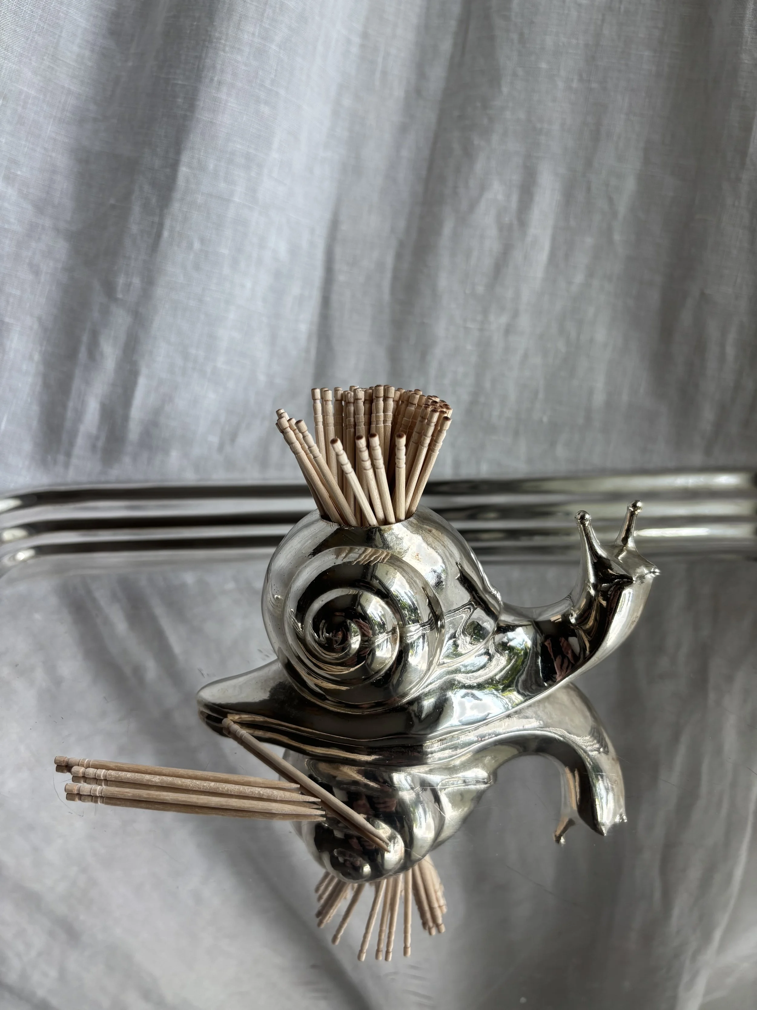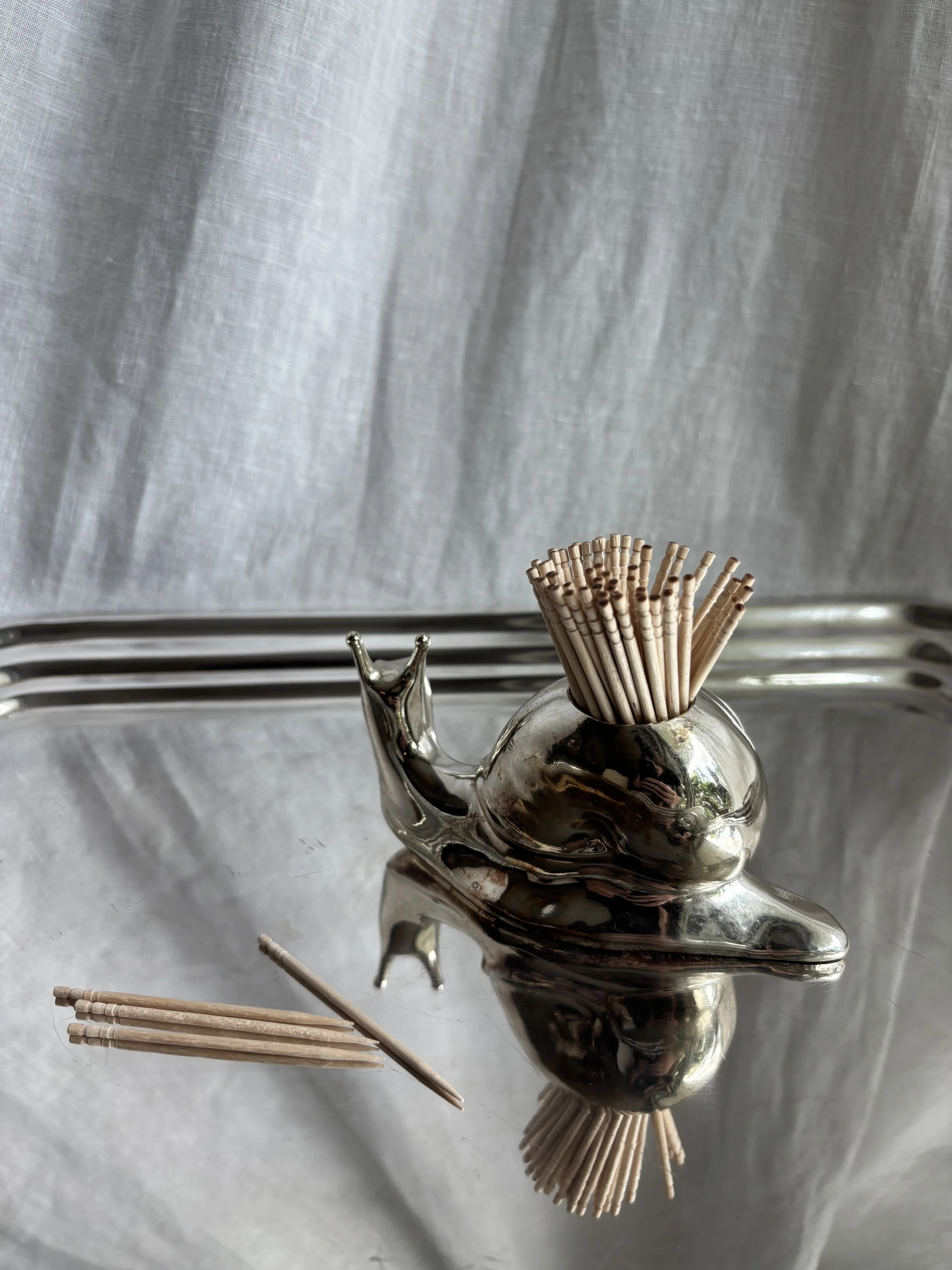 Darling toothpick/match holder in silver plate featuring snail motif. Perfect vintage patina.