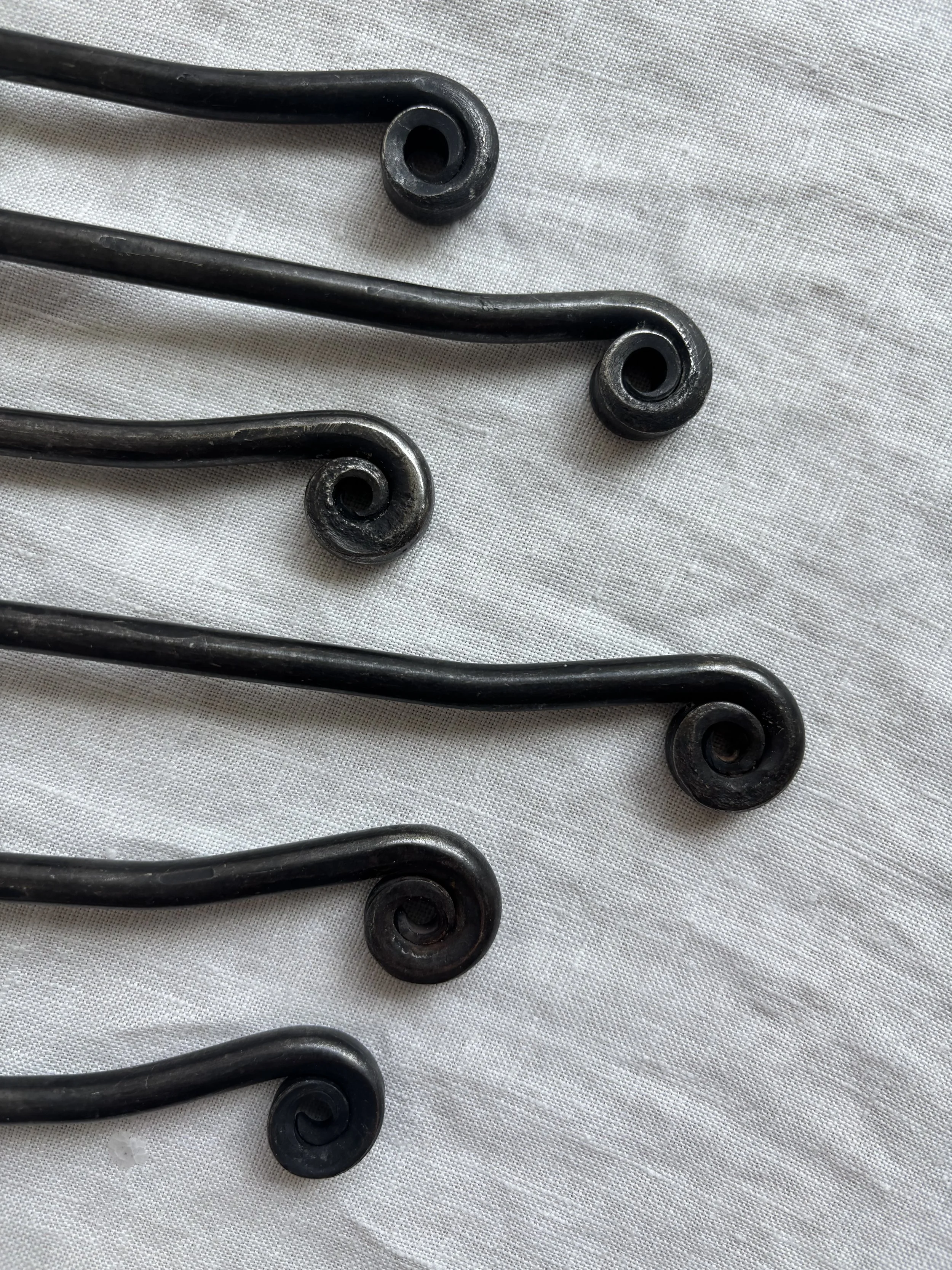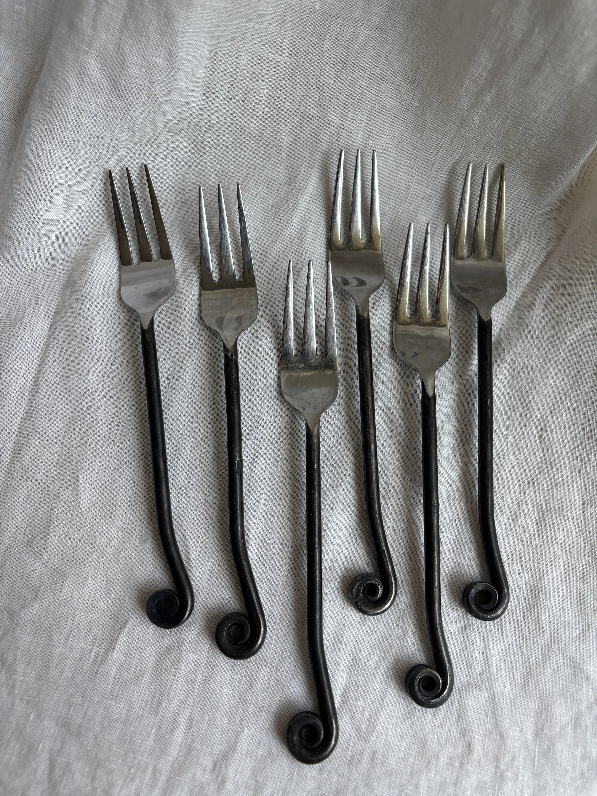 Wonderful dessert fork set in stainless steel featuring hand-forged swirled unpolished handle ends. This set includes seven dessert forks.