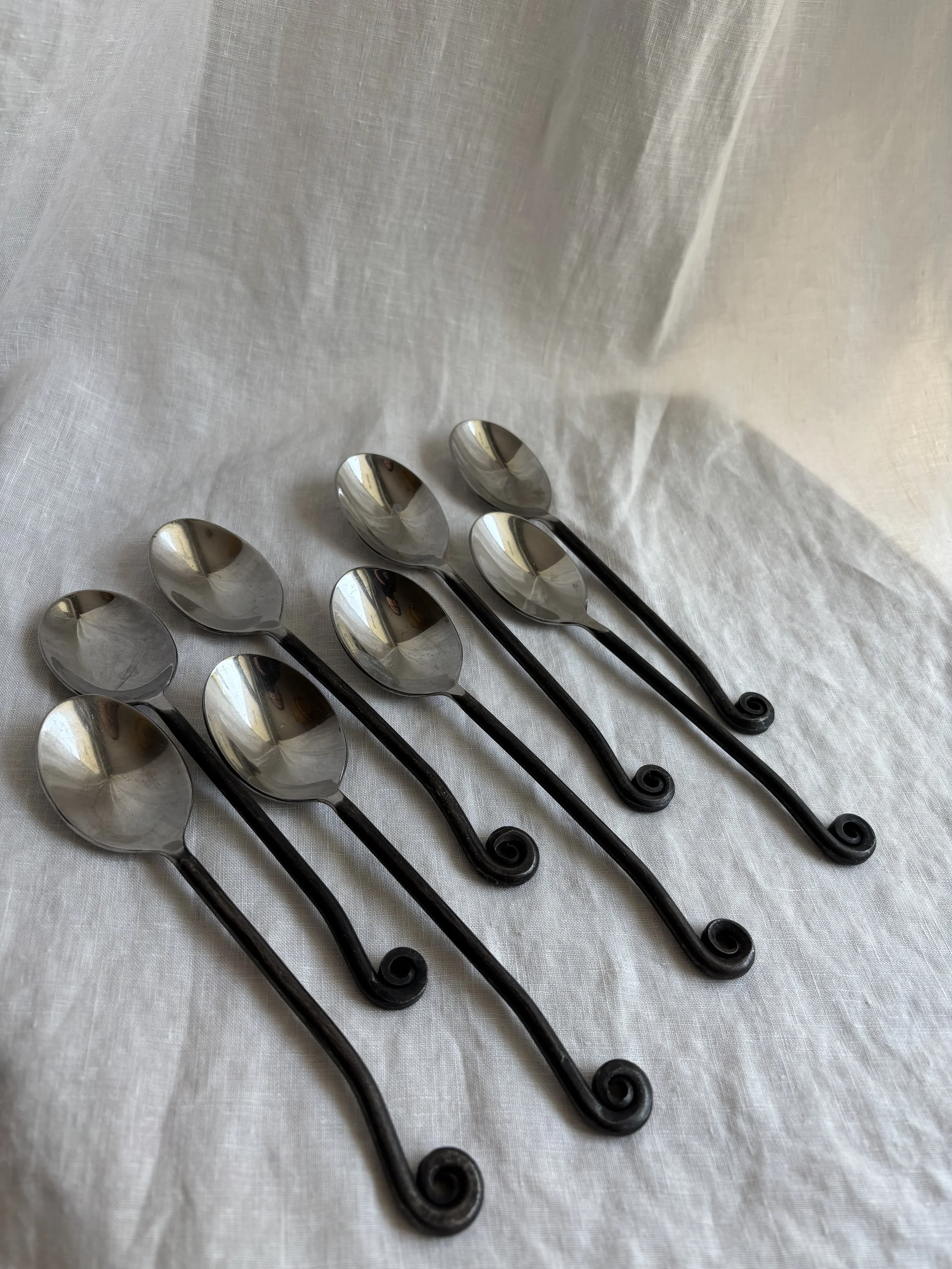 Wonderful dessert spoon set in stainless steel featuring hand-forged swirled unpolished handle ends. This set includes eight dessert spoons.