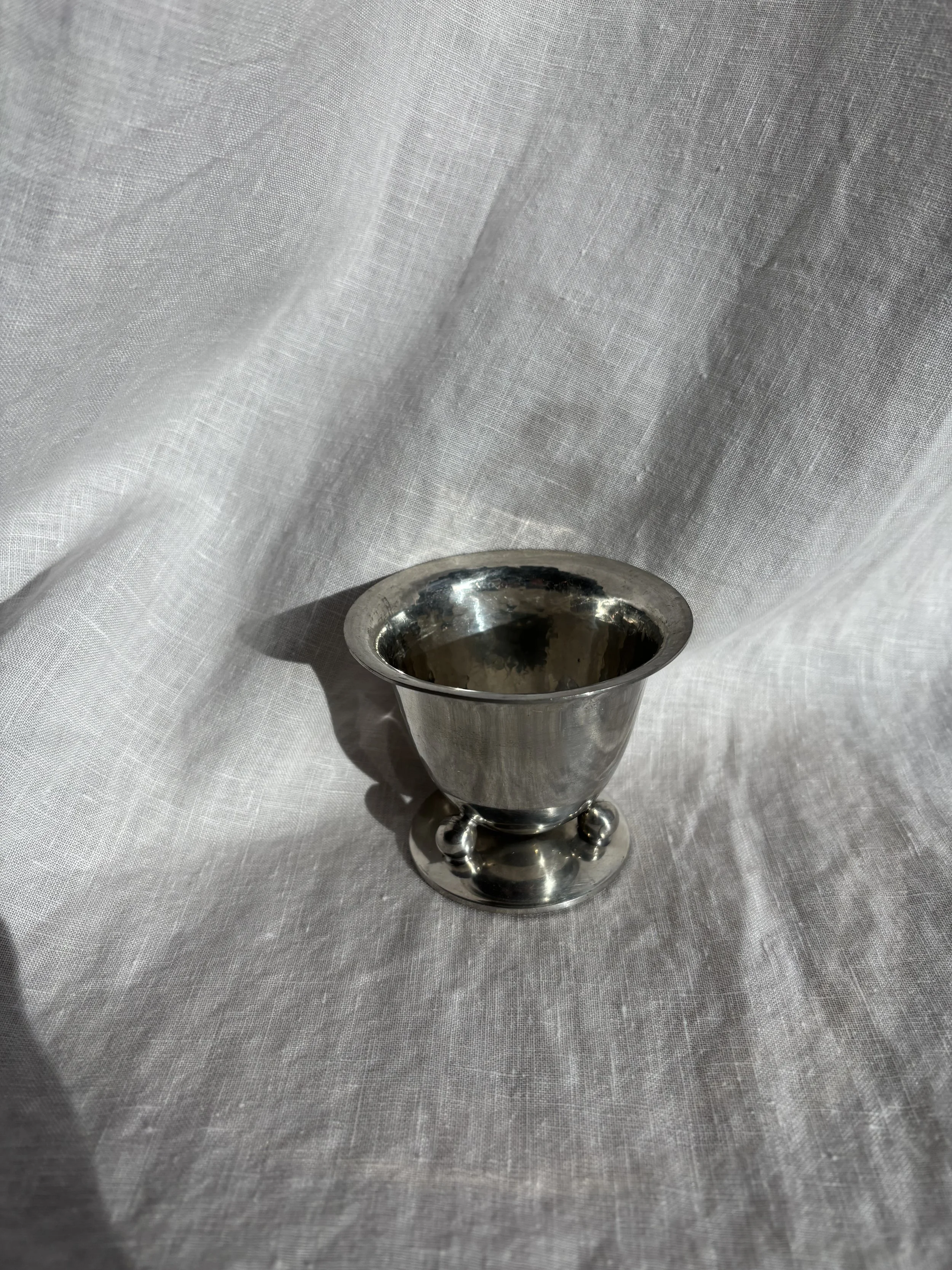 Set of 6 stunning silver plated cups featuring spherical feet on rounded bases and subtle hammered detail throughout. Made in Denmark.